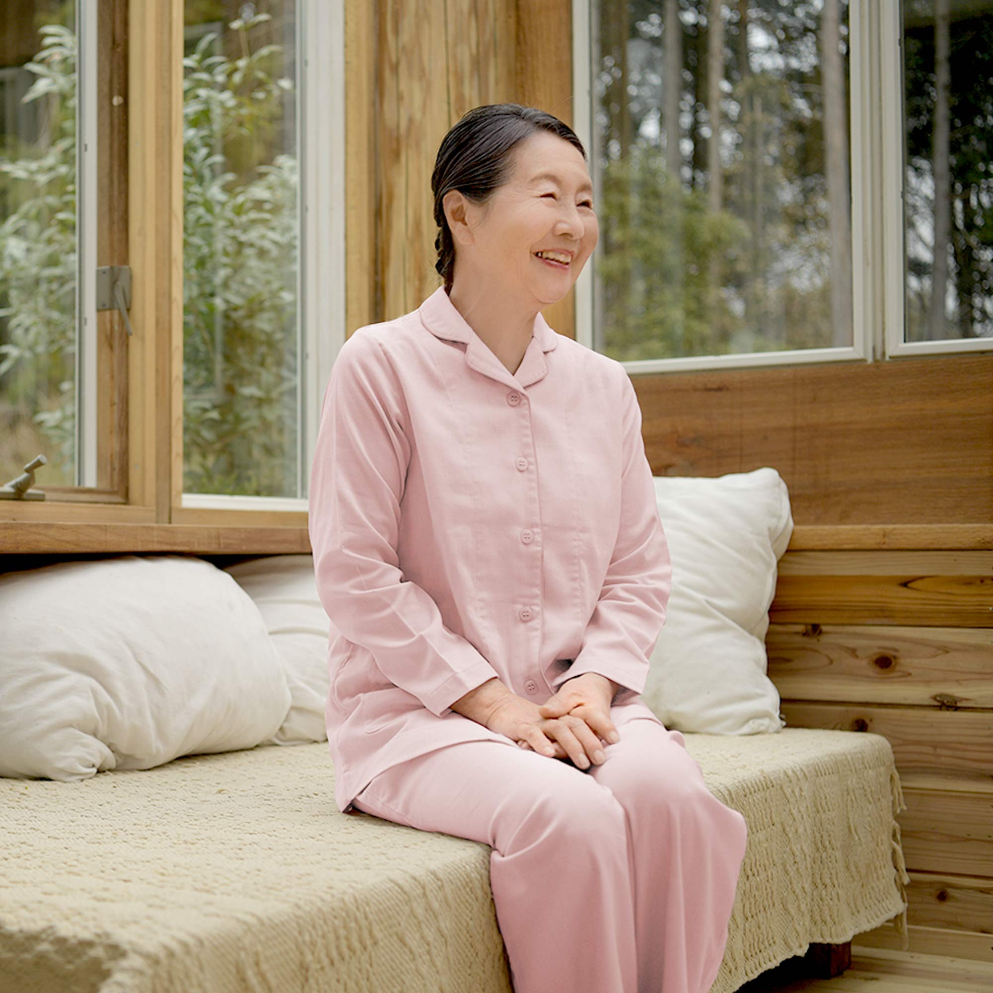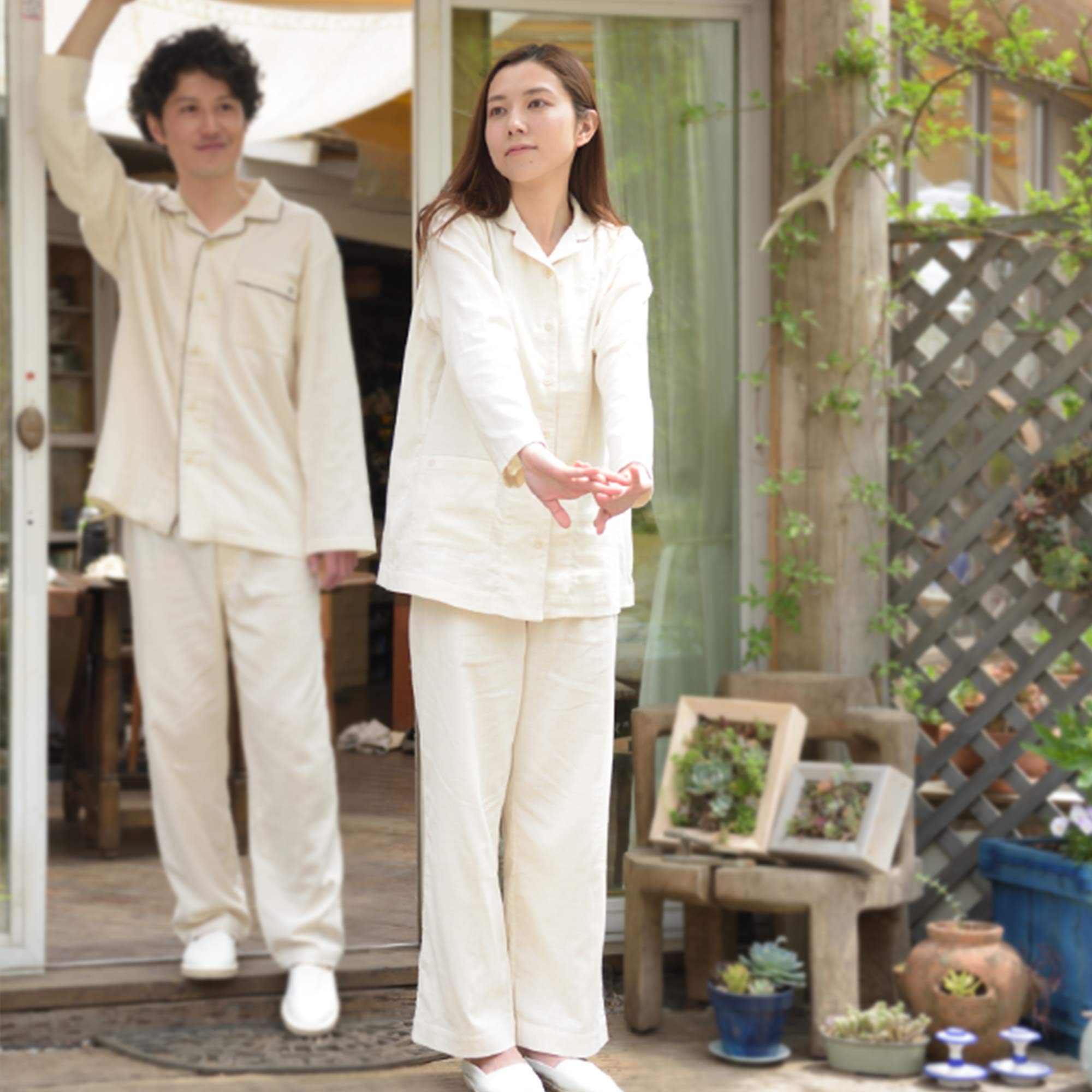 少しのストレッチで寝返りが驚くほど楽になる2重仕立てのガーゼパジャマ。女性らしいシルエットで着心地はゆったり。伸縮性のあるポリウレタン糸を綿糸でくるっと巻いているのでお肌に触れる部分は綿100%、内側はできるだけ袋縫い仕様で敏感肌の方も安心です。