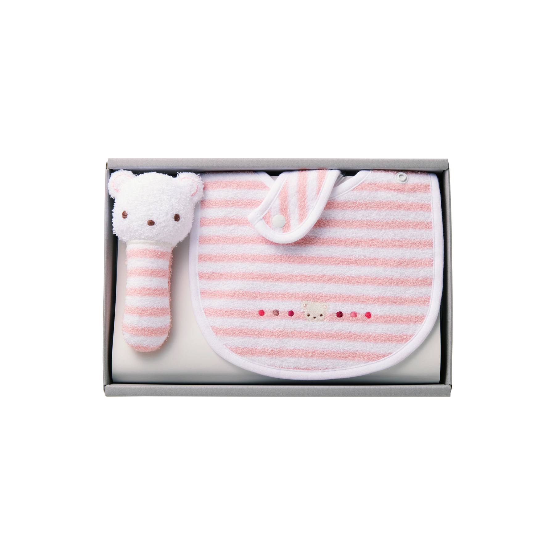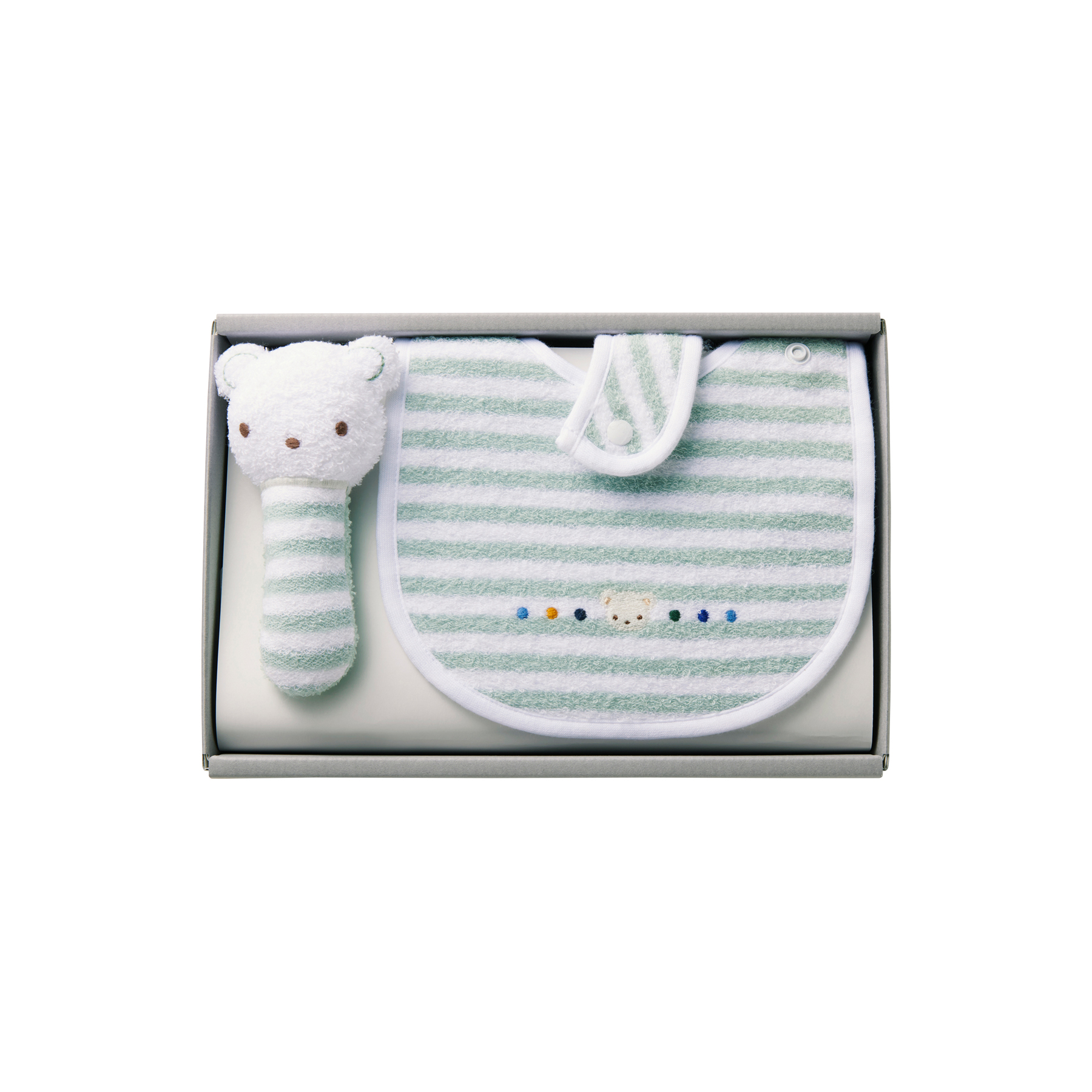 スタイとマスコットのギフトセット。くすみカラーのパイルボーダーを使用したスタイは、クマちゃんとカラフルなドットの刺繡入り。