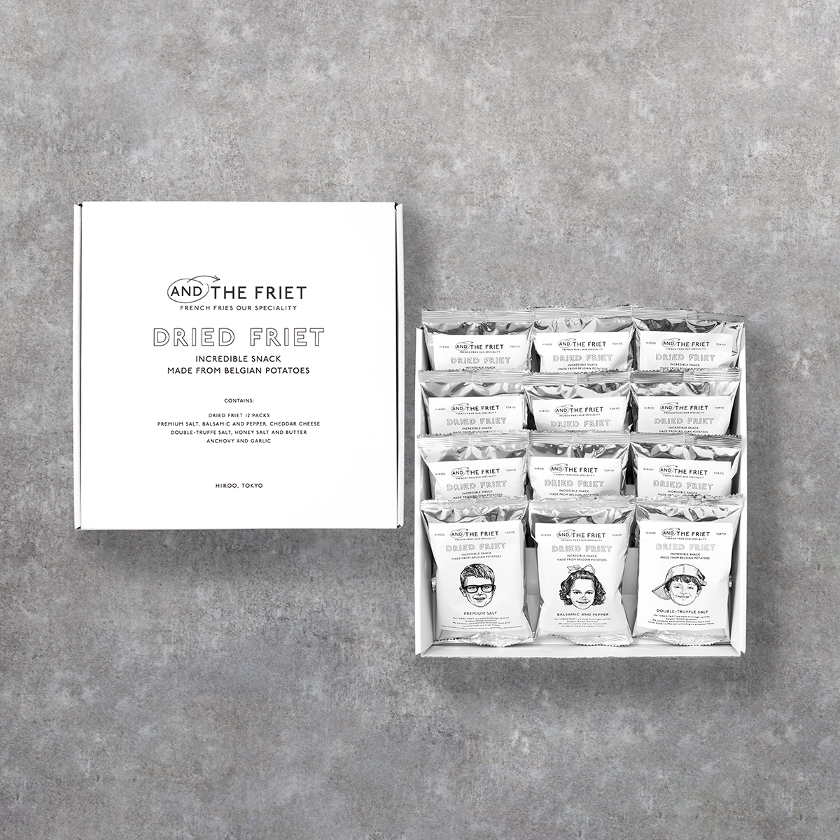 AND THE FRIETのMINI 12-PACK GIFT BOXは、おいしさと楽しさを詰め込んだ、特別なギフトボックスです。様々なシーンでの気軽なプレゼントから、フォーマルなギフトまで、このユニークなドライフリットのセットで、大切な人への感謝の気持ちを伝えましょう。各フレーバーを味わいながら、共に幸せな時間を過ごすことができる、そんな贈り物を提供します。
