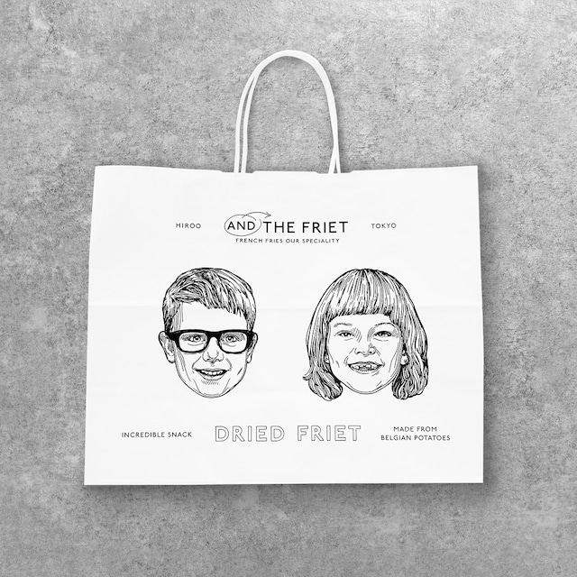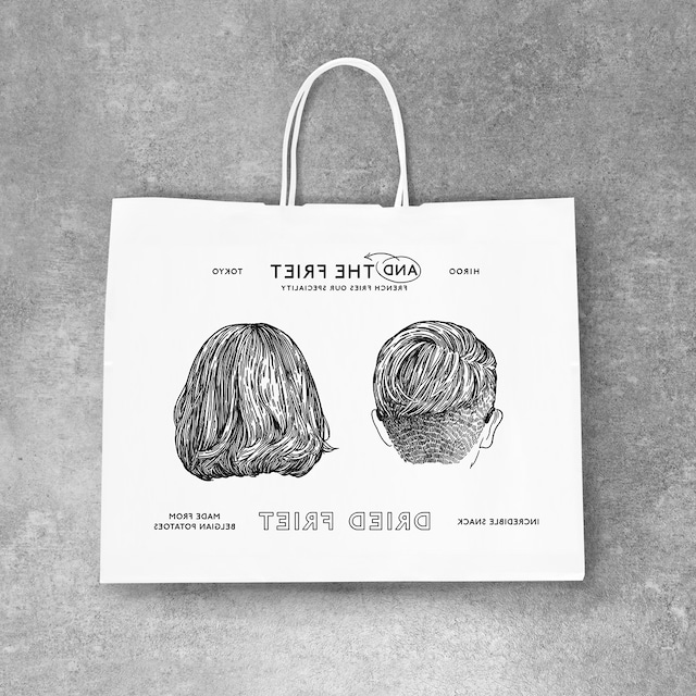 紙袋もアートディレクター平林奈緒美氏によるデザイン、ヨーロッパのイラストレーターAnje Jager氏によるイラストが描きおろされた白い紙袋。おもて面にはキャラクターの顔が、裏面には後頭部が描かれています。 ギフトボックスを入れてお渡しするのにぴったり!