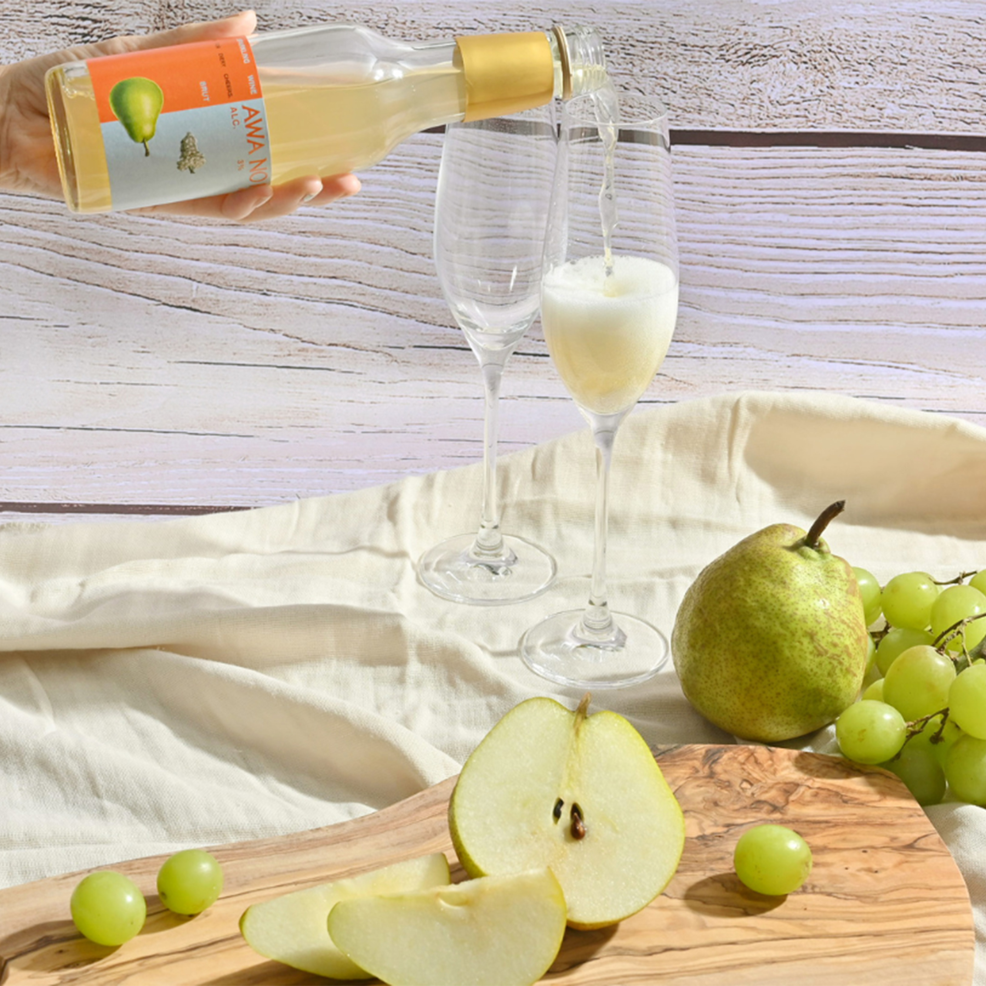 大口注文・法人のお問い合わせはこちらふんわり華やかに香る洋ナシスパークリング AWANOHI PEAR BRUT アワノヒ ペアブリュット AWANOHIは「全ての人に幸せな乾杯を」という想いから生まれたフルーツスパークリング。 ペアブリュットは、ふんわりと優しく広がる洋ナシのアロマ、メレンゲのような繊細な泡、すっきりとした口当たりが特徴の洋梨のスパークリング。 国産ラ・フランスをはじめ7種の高級洋ナシと白ブドウを贅沢に使用しました。 シャンパンやスパークリングワインだと度数が高すぎて、酔いすぎてしまう。 お酒が弱い方もいるけれど、相手と、みんなで同じもので乾杯したい。 そんなときにぴったりな、低アルコールのスパークリングです。 甘すぎないからこそ、食事と合わせてもお飲みいただけます。 ワイングラスに注ぎ、注いだ瞬間の洋梨のふんわりと広がる香りとジューシーな味わいをお楽しみください。