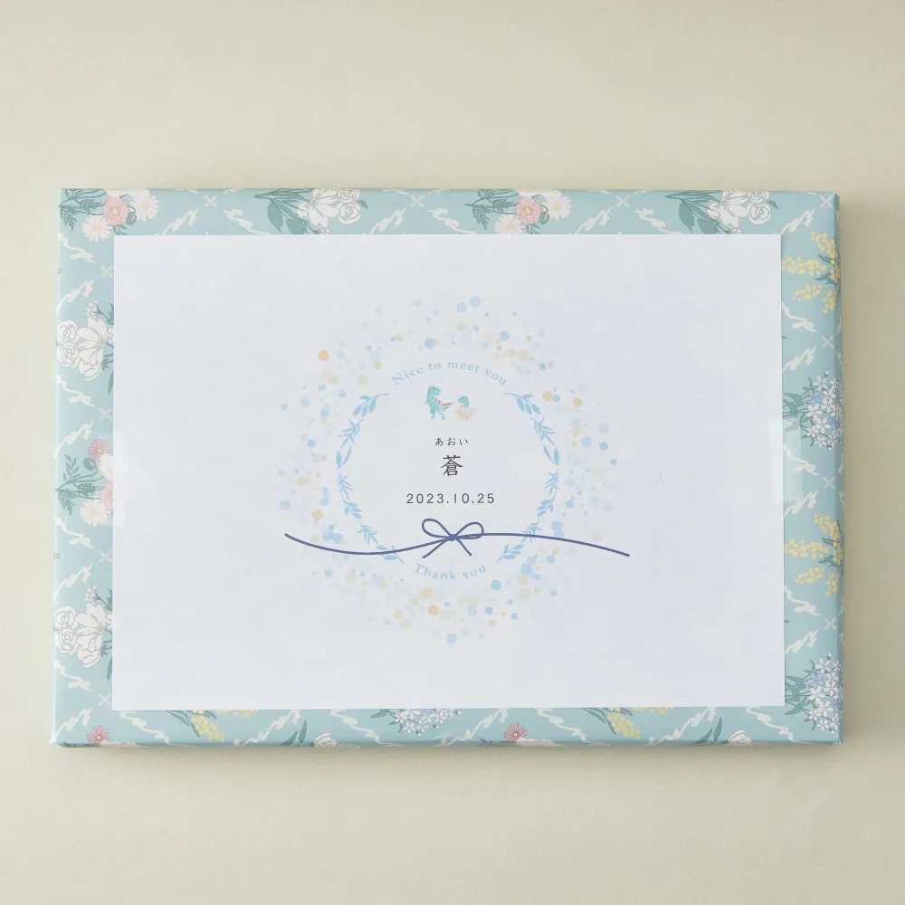 お子様の名前や写真をお入れしたデザイン紙をお品物に貼ってお届けいたします。