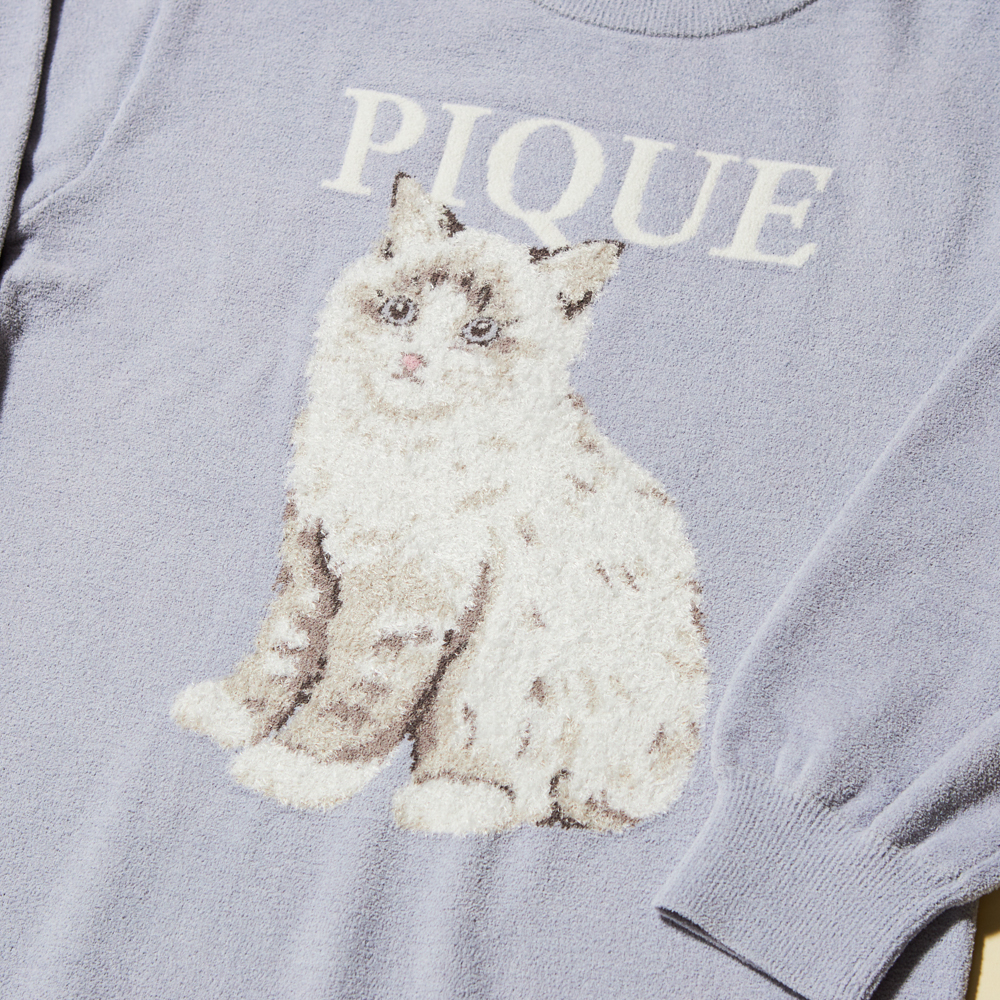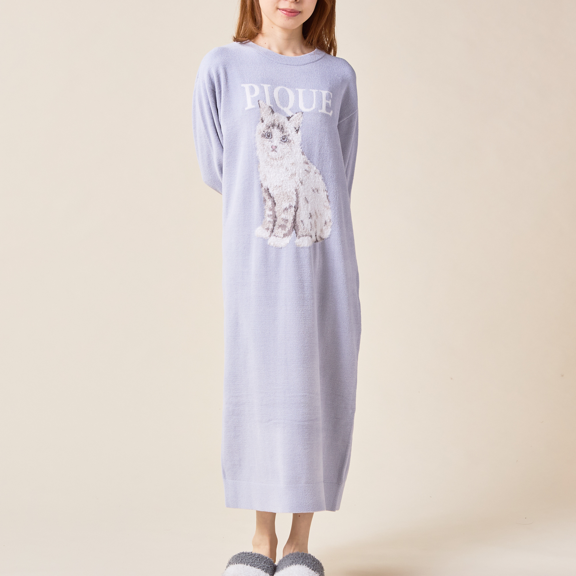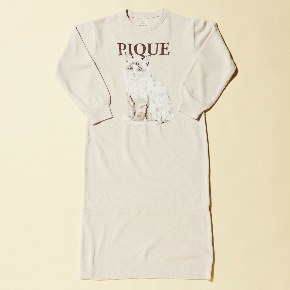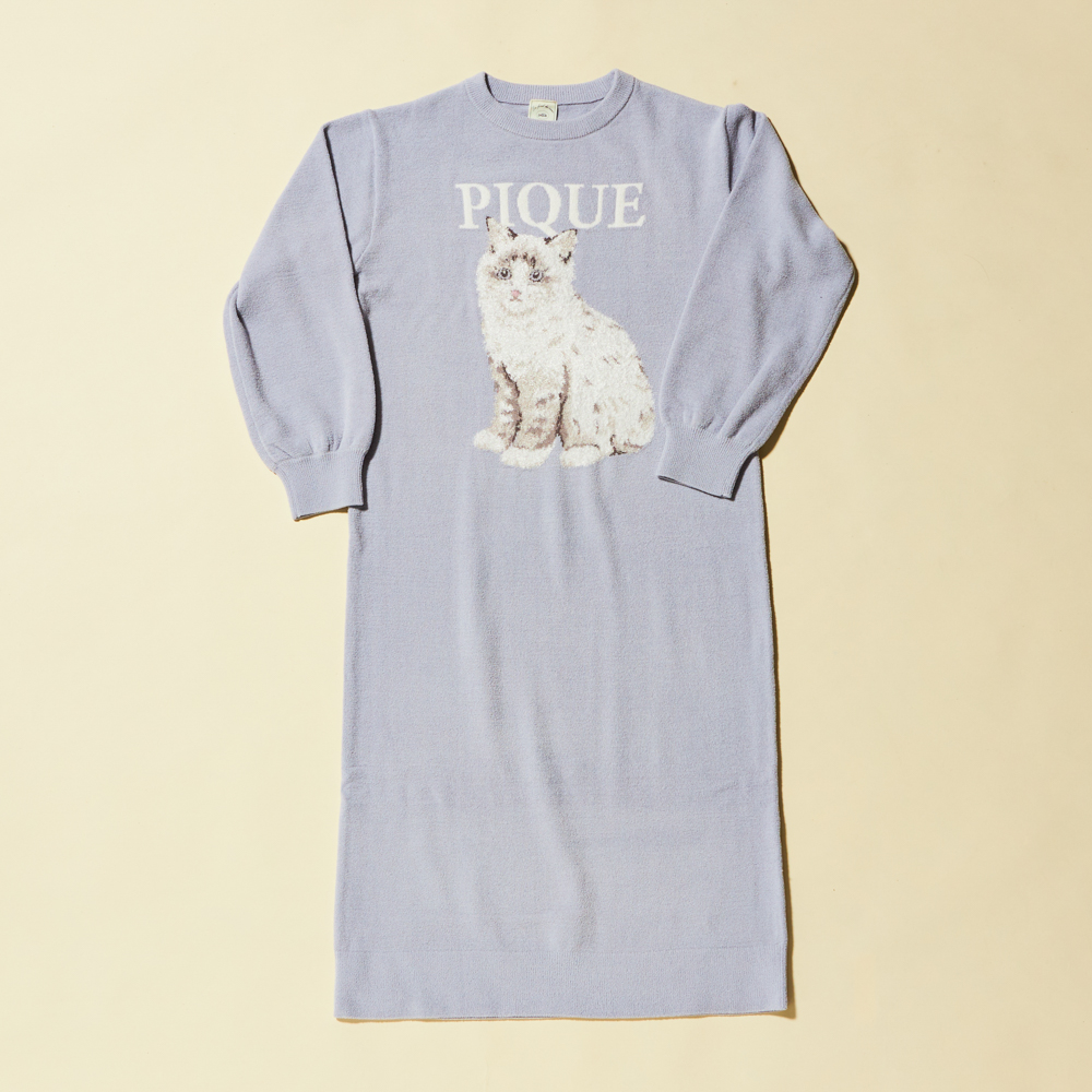 大口注文・法人のお問い合わせはこちらふわふわとした毛並みの愛らしいサイベリアンをモチーフにしたジャガード入りワンピースです。秋口にもさらっと着やすい薄手のエアモコ素材を使用し、柄を大きくあしらっているのがポイント。 ゆとりのあるパフスリーブで猫のような丸みを出しつつ、やや長めの丈感で大人カジュアルなテイストに仕上げました。 色は幅広い世代にお楽しみいただけるよう、大人可愛い発色のピンク、ブルー、ベージュをご用意。同時期に展開するエコファーシリーズの小物との組み合わせもおすすめです。