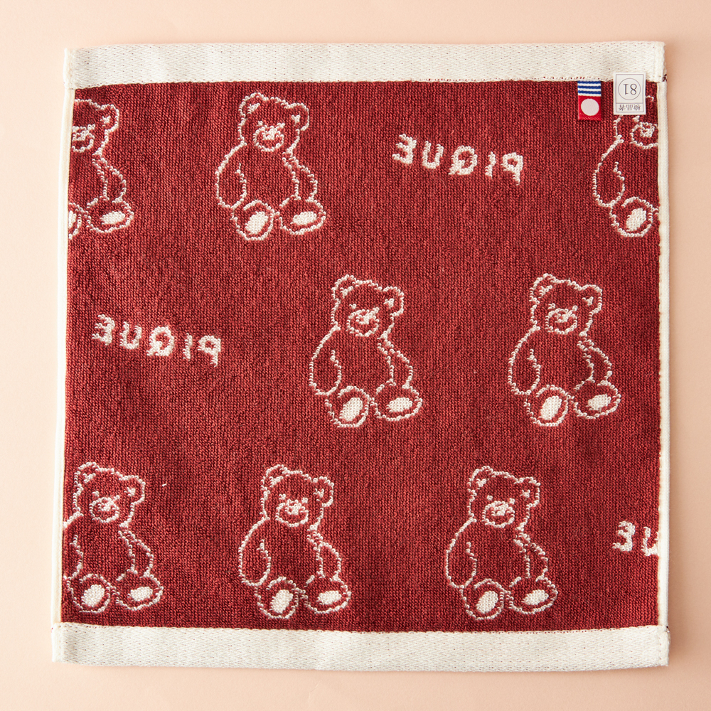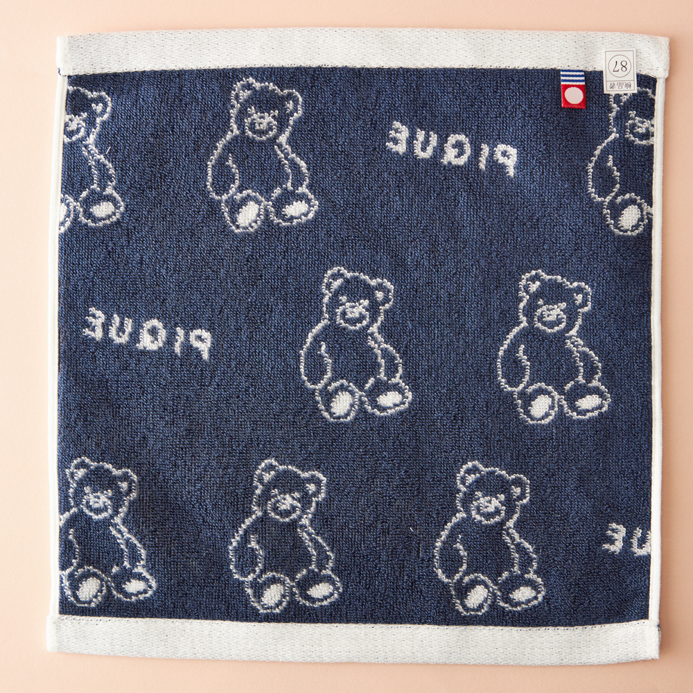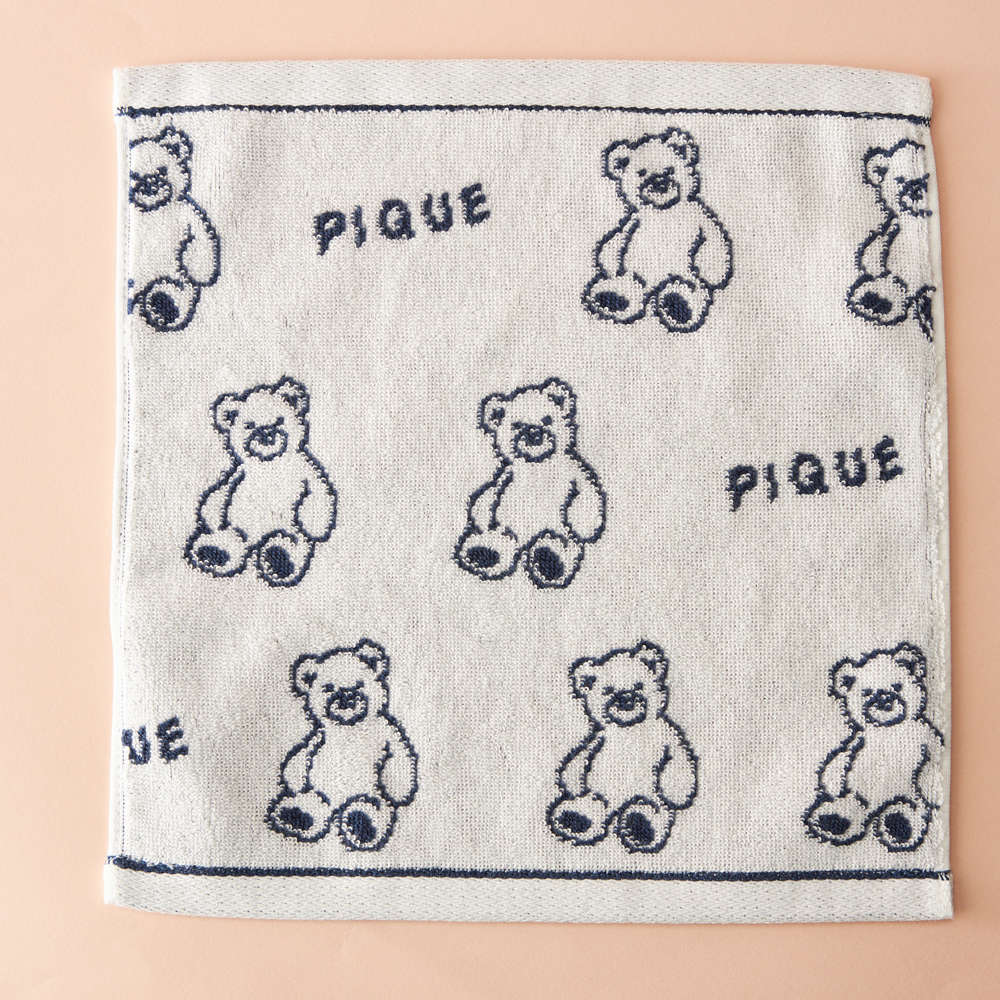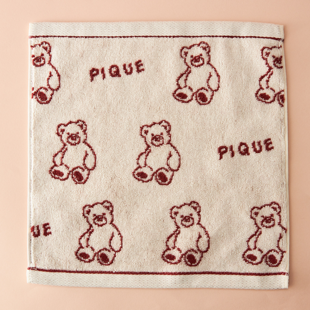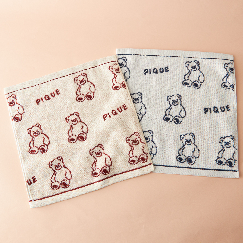 大口注文・法人のお問い合わせはこちら線画タッチのふっくらとしたベアと、PIQUEのロゴを組み合わせたハンドタオルです。ふっくらとした柔らかな手触りを堪能いただける、今治で織り上げた高品質なハンドタオルです。色は落ち着いた風合いのレッドとネイビーをご用意しました。 お好きな1枚をお選びいただけます。 【Fabric】 柔らかな肌触りのコットン100%です。