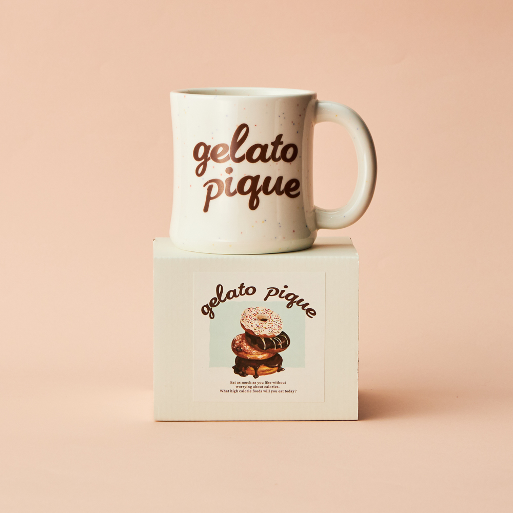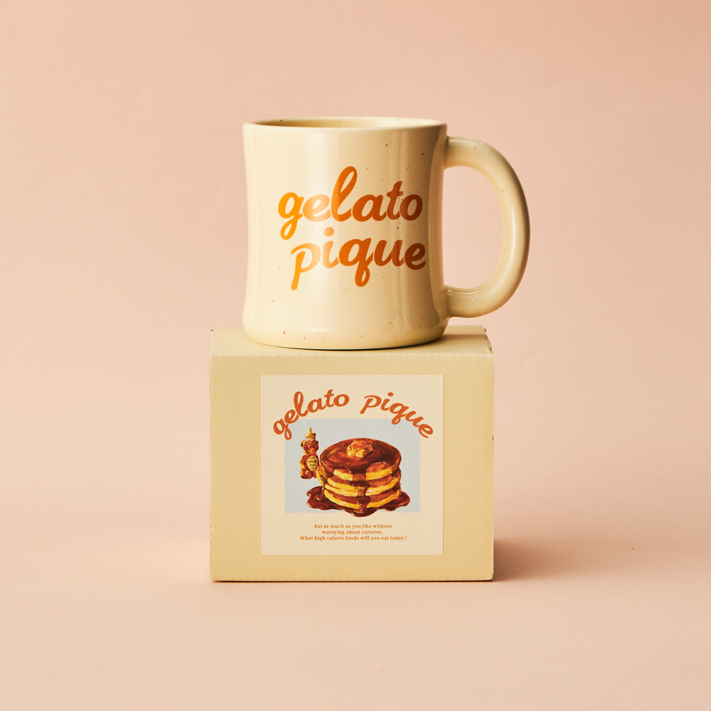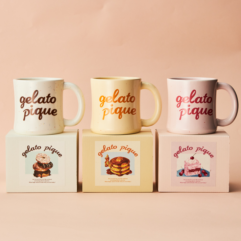 大口注文・法人のお問い合わせはこちらふわふわパンケーキにチョコレートたっぷりのドーナツ、見た目も可愛いチェリーケーキ。甘いハイカロリースイーツをパッケージにプリントした、食欲の秋にぴったりのロゴ入りマグカップです。 ぽってりとしたフォルムのカップには、カラフルなネップのようなデザインに仕上げました。色はオフホワイトとイエロー、ピンクの3色展開。スイーツを描いたシール付きのパッケージに入れてお届けするので、プレゼントにもぴったりです。