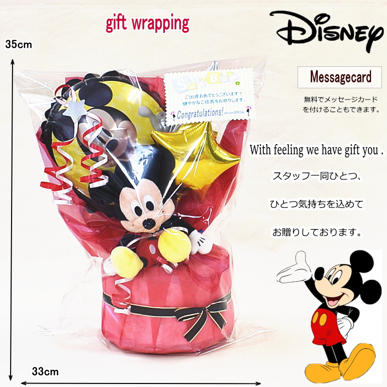 大口注文・法人のお問い合わせはこちらディズニーの大きなバルーンとミッキーのぬいぐるみが付いている、ディズニー好きにはたまらない1段おむつケーキです。