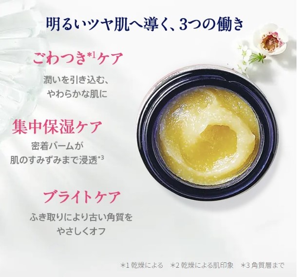 「お風呂で"温めバーム"ケア」 肌がこわばる寒い夜。 特に乾燥が気になる方へのレスキューケア。 お風呂で湯船に浸かりながら、潤い&角質ケア(コットンクロスまたはタオルで拭き取り余分な角質を取り去ること)まで。 透明感あふれる肌に仕上がります。 使用量:パール大 1~2個 1.洗顔後、マッサージをしながらバームをなじませます 2.付属のコットンクロスまたはホットタオルで、顔全体を温めます※お湯で絞り、温かく感じる状態でお使いください 3.温まったら、バームを拭き取ります。※顔にかかった布が冷たく感じる前に外します ポイント:ゆっくりと香りをお楽しみください。 お手入れのあとは、通常のスキンケアステップで仕上げてください。