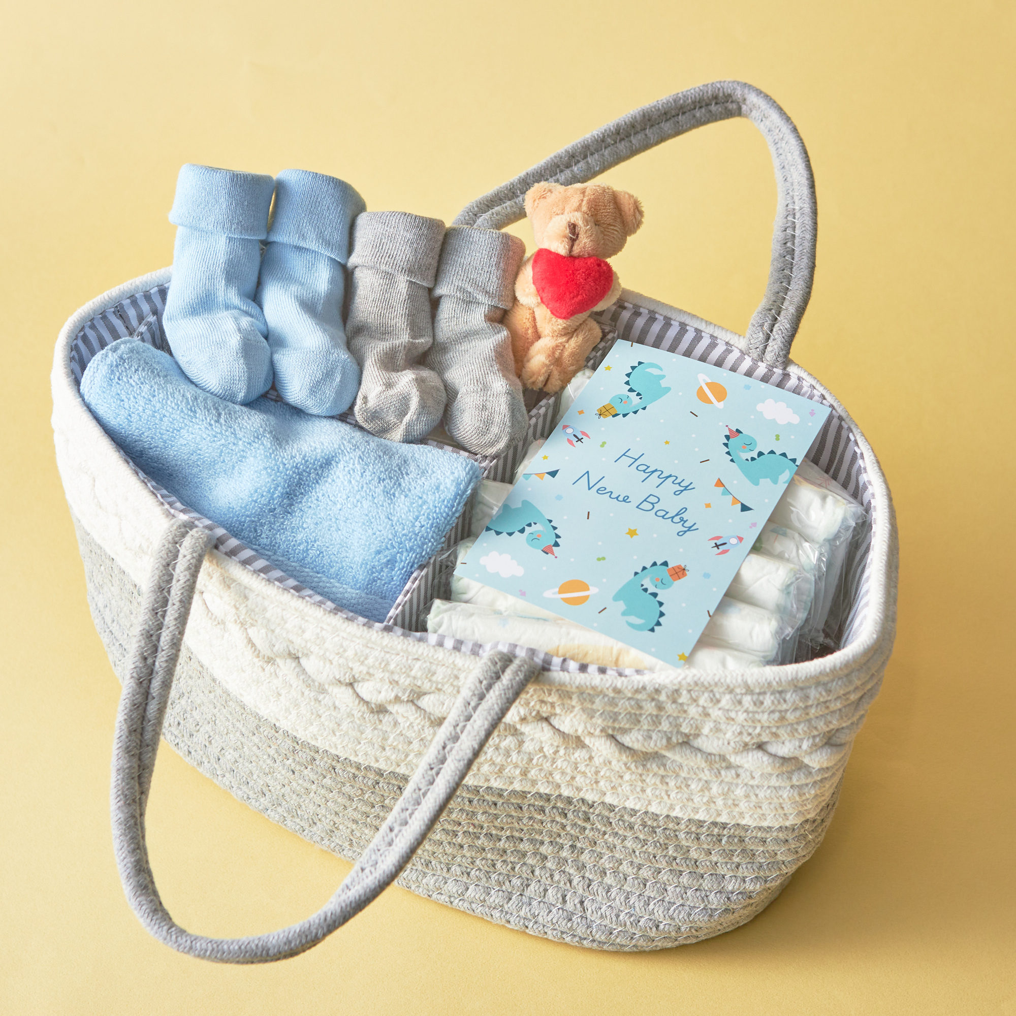 おむつ・ソックス・名入れができる今治ハンドタオルなど実用的なグッズを詰め込んだ、ママがうれしいおむつストッカー。インテリアに馴染むデザインで、持ち運びにも便利です。子どもの成長に合わせておもちゃを入れたり、文房具を入れたりと長く使えるため、出産祝いにぴったりです。