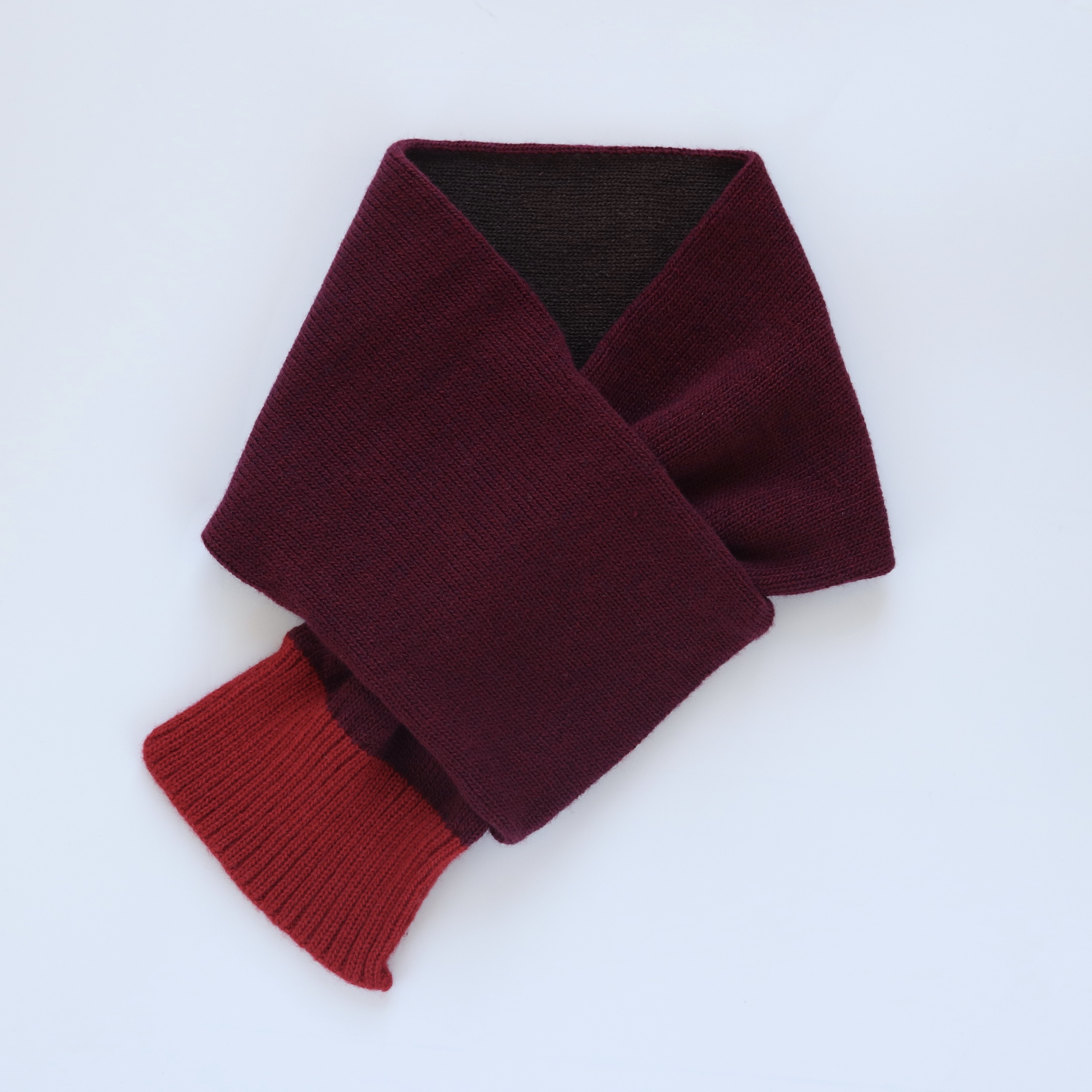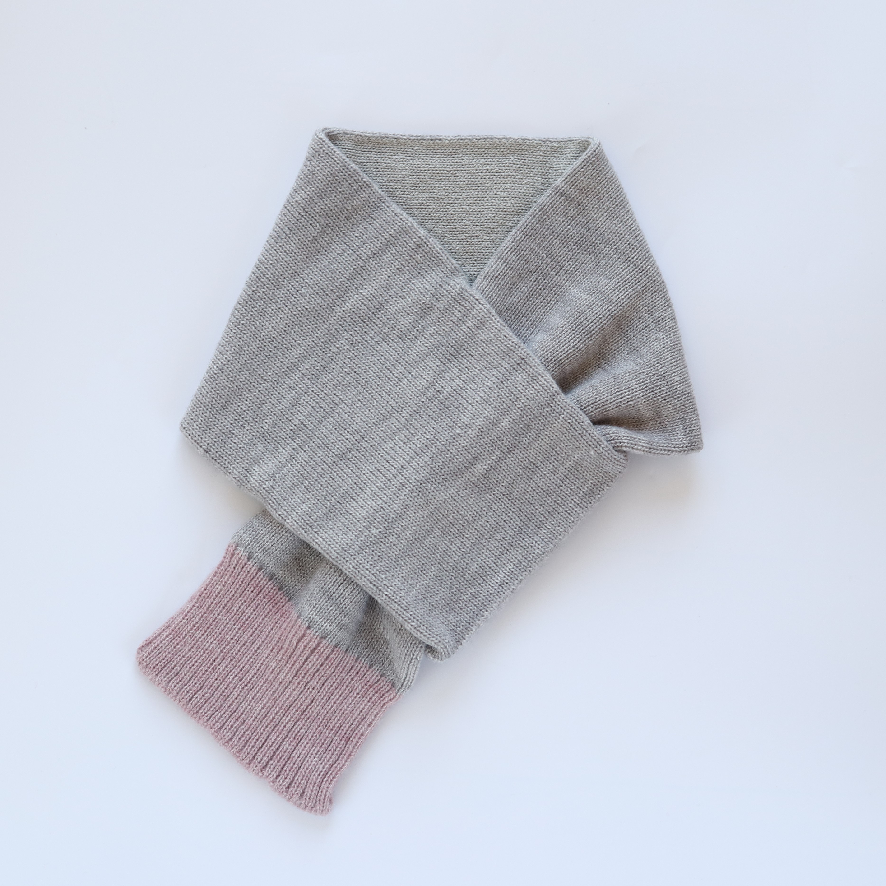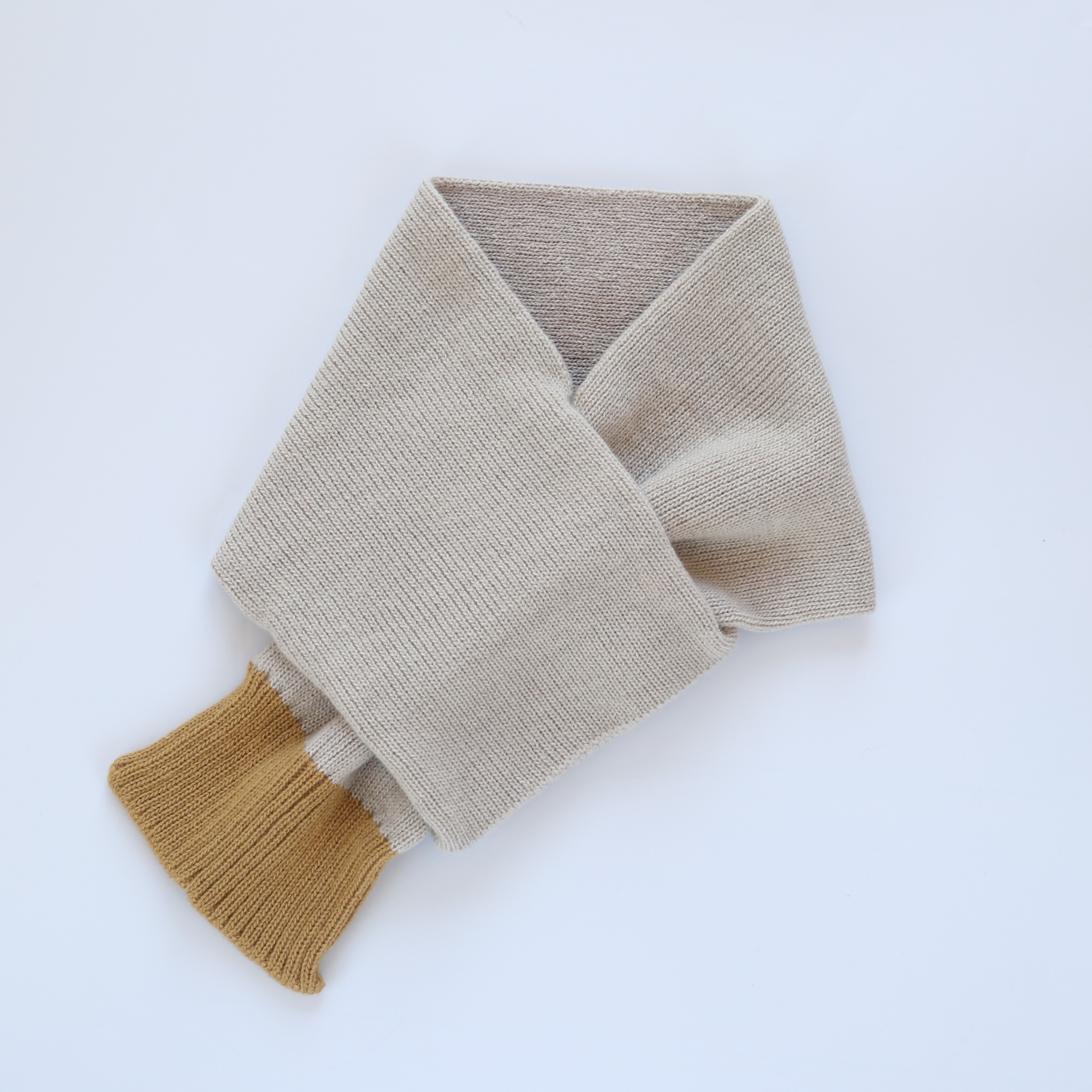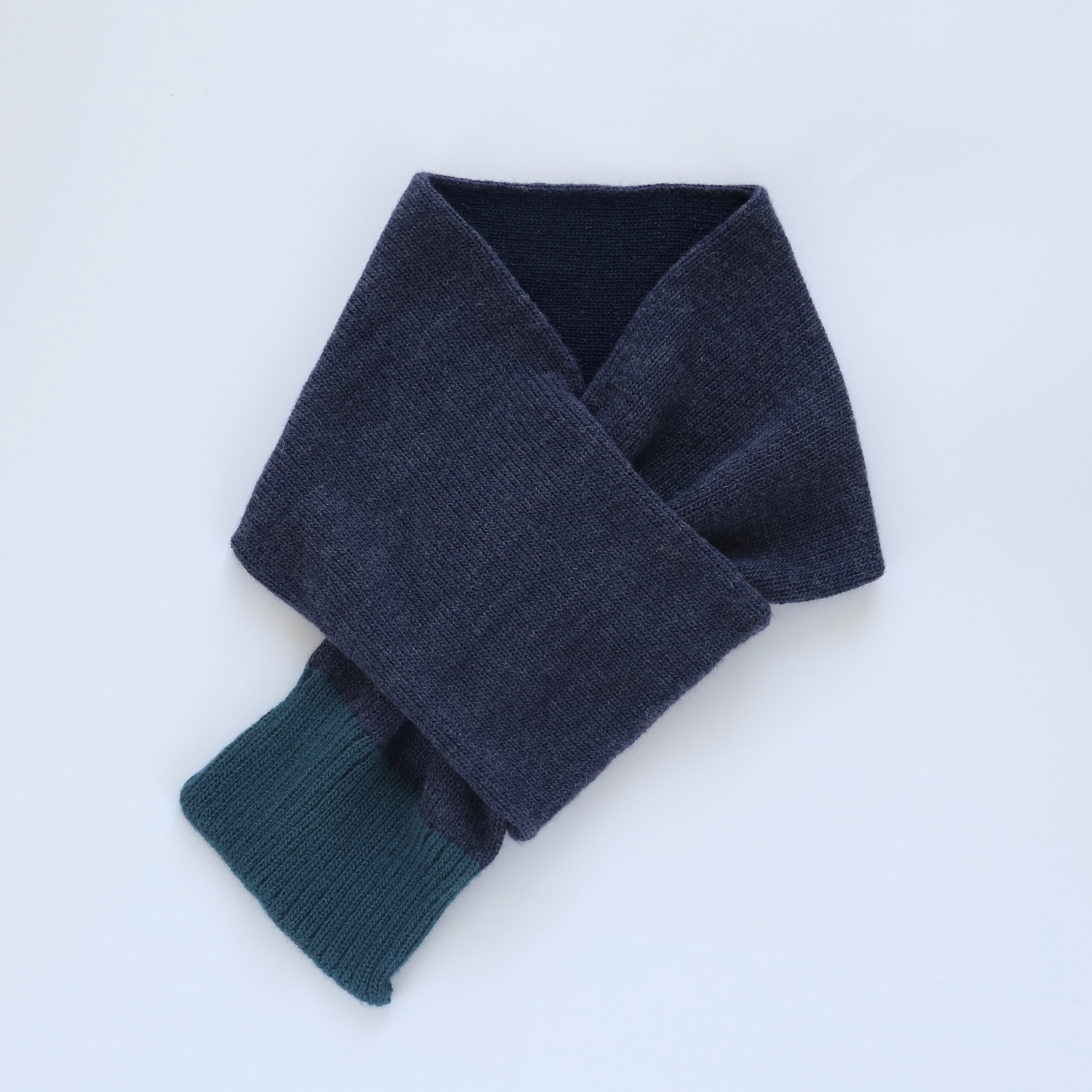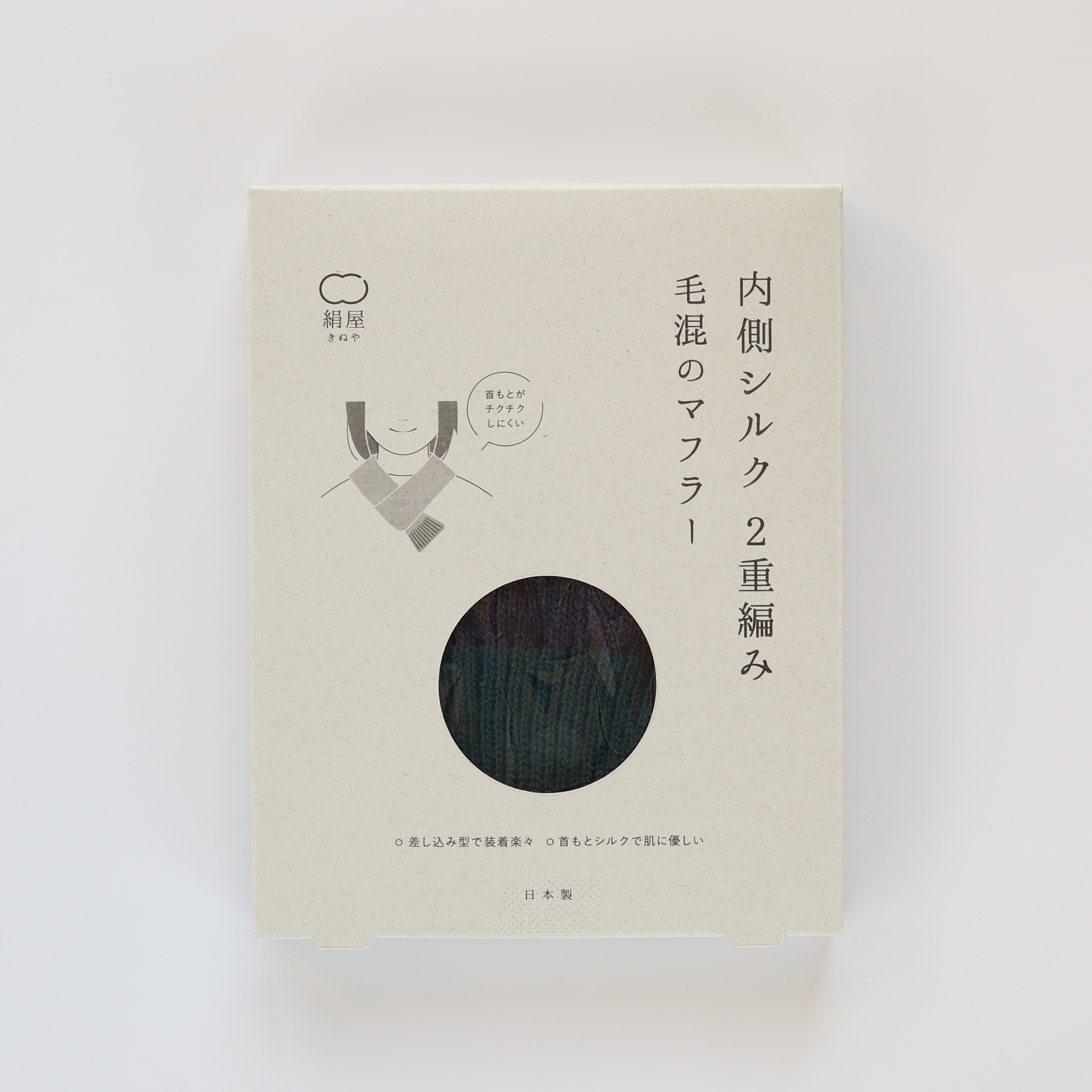 大口注文・法人のお問い合わせはこちら首元の内側に、柔らかなシルクを使用しています。 外側は、保温性の高いウール・カシミヤ混の2重編みです。 薄手で暖かく、首元を冷えから守ります。 穴に通すだけのため、着脱が簡単です。