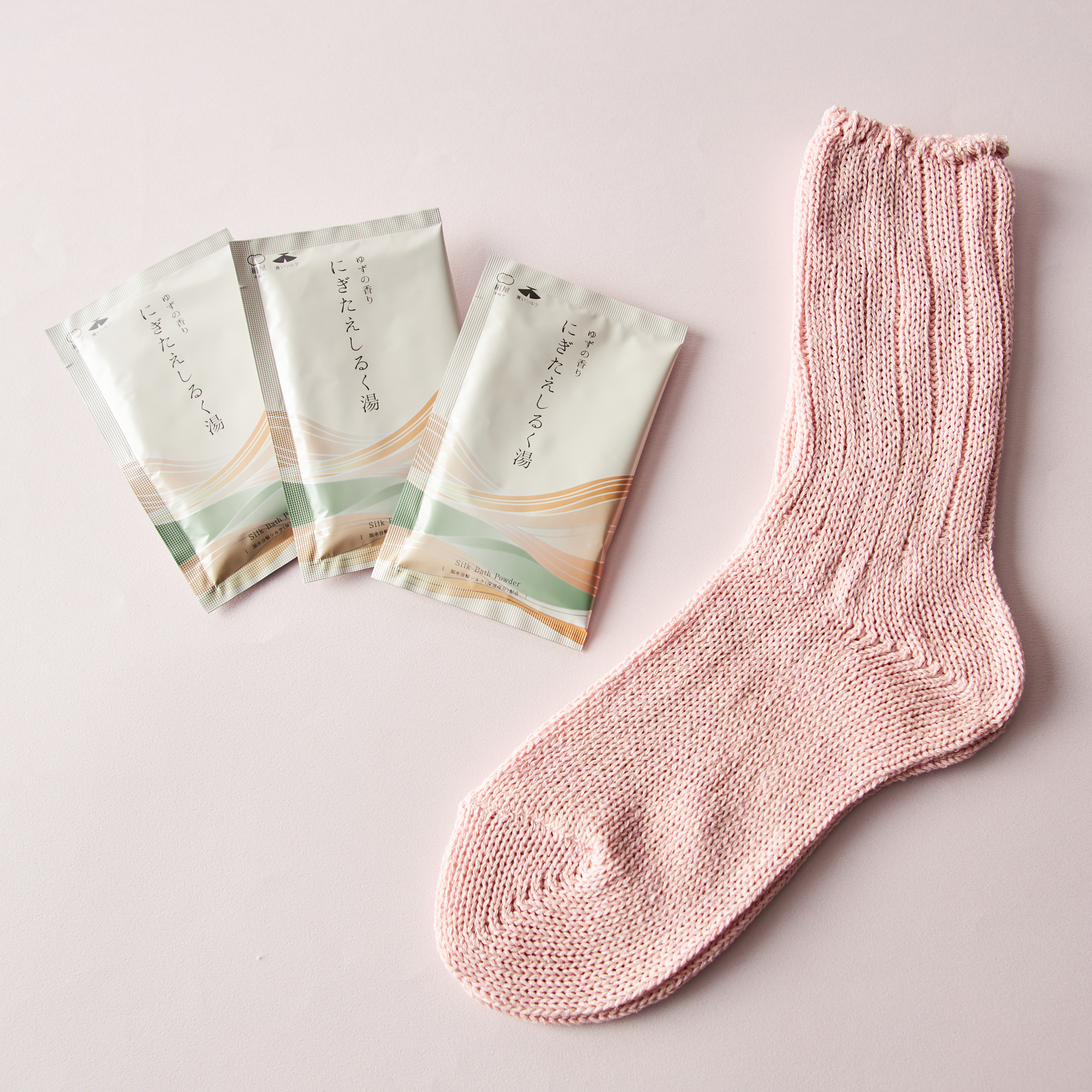 大口注文・法人のお問い合わせはこちら希少な国産シルクの保湿成分を配合したゆずの上品な香りの入浴剤と、ざっくりとした編みのシルク100%靴下のギフトセットです。 靴下はその名の通りお風呂上がりに履いても、素早く水気を吸って放湿するので蒸れずに心地よい温かさを保ちます。