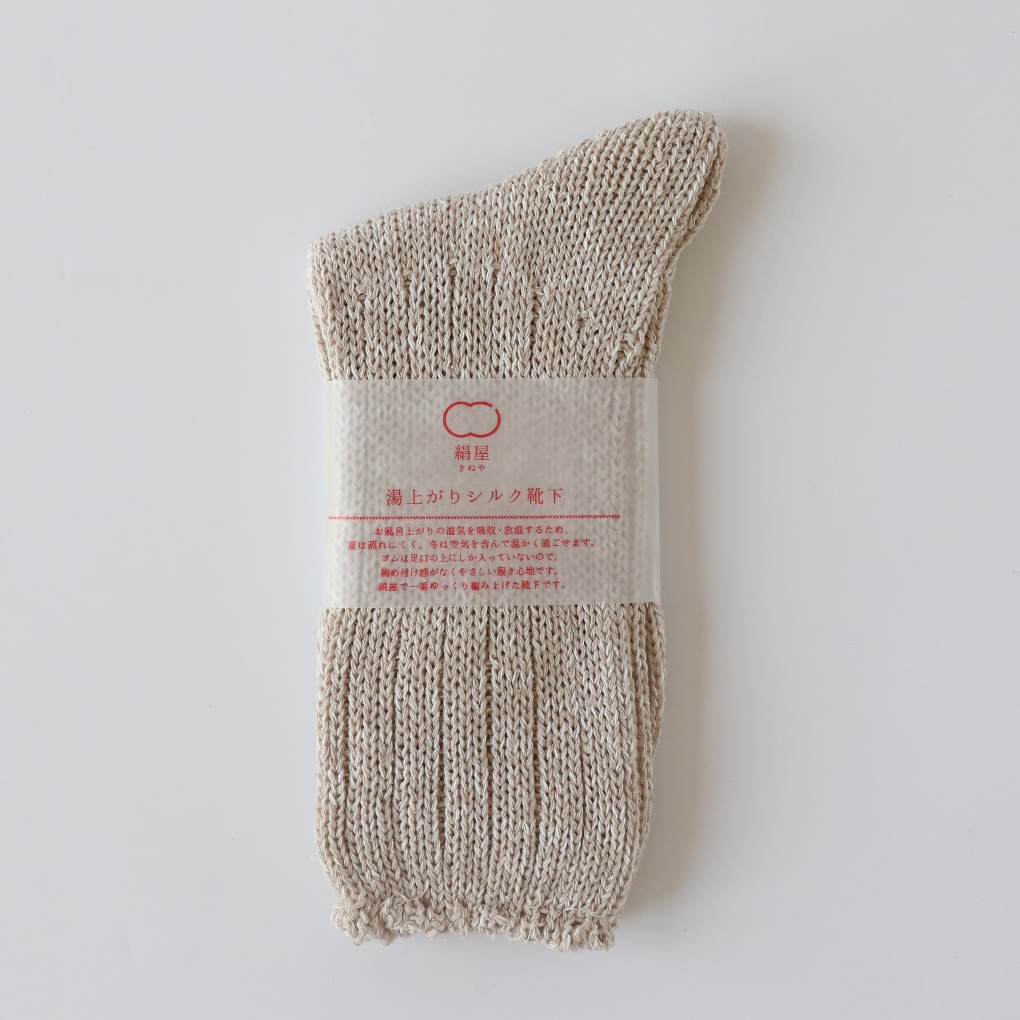 シルクを100%使っているため、お風呂上がりの足でもシルクが素早く水気を吸い取り放湿するので、蒸れずにやさしいあたたかさを保ちます。 履き口に数本しかゴムを入れず、締め付け感をなるべくなくしてやさしい履き心地にこだわりました。 締めつけ感のないため、お風呂上がりから就寝時まで着用していただけます。