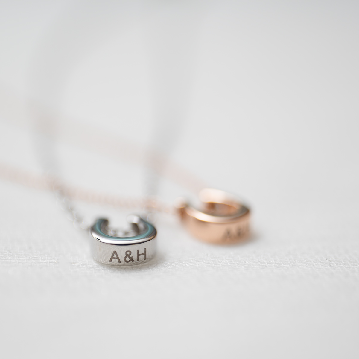 小さめサイズなので男性でも身につけやすく、ペアに不慣れなカップルにもおすすめです。少し厚みのあるペンダントなので、ホースシューの底面に【ご希望英数字4文字まで ※アルファベットは大文字のみ】の彫刻を致します。 (オプション選択画面にてお選びいただけます。)