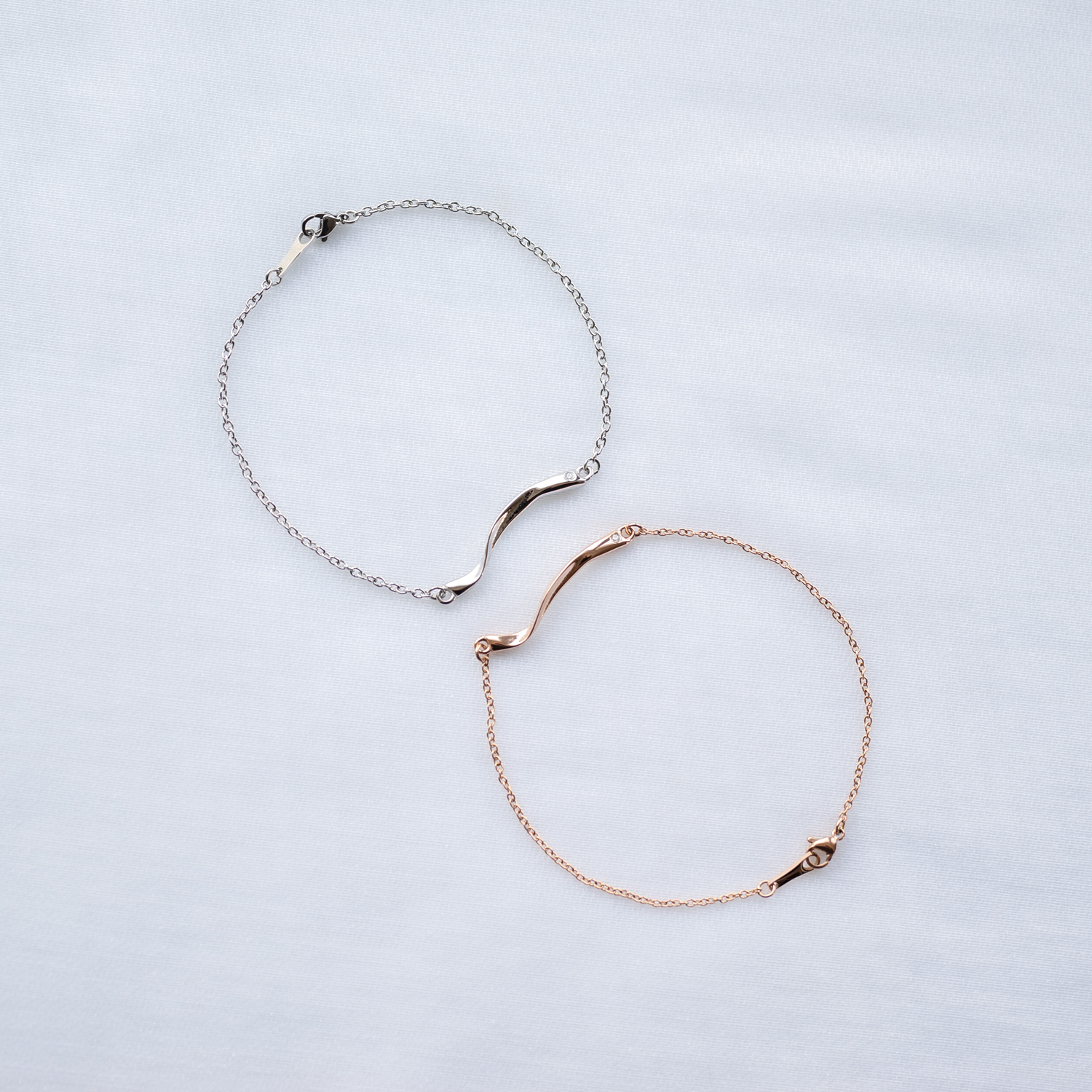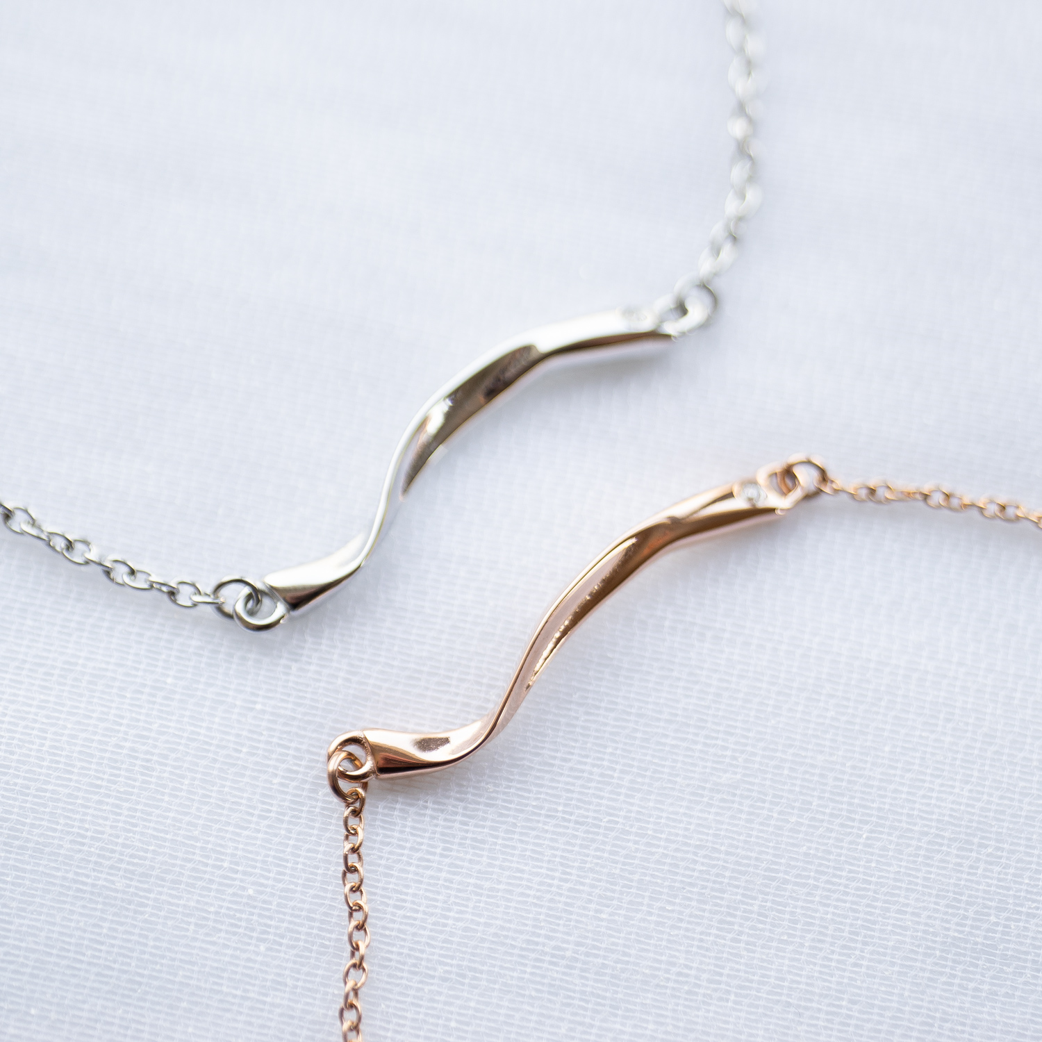 メビウスの帯をモチーフとしたペアアクセサリー。流麗なデザインで、手首によく合うシルエットとなっています。
