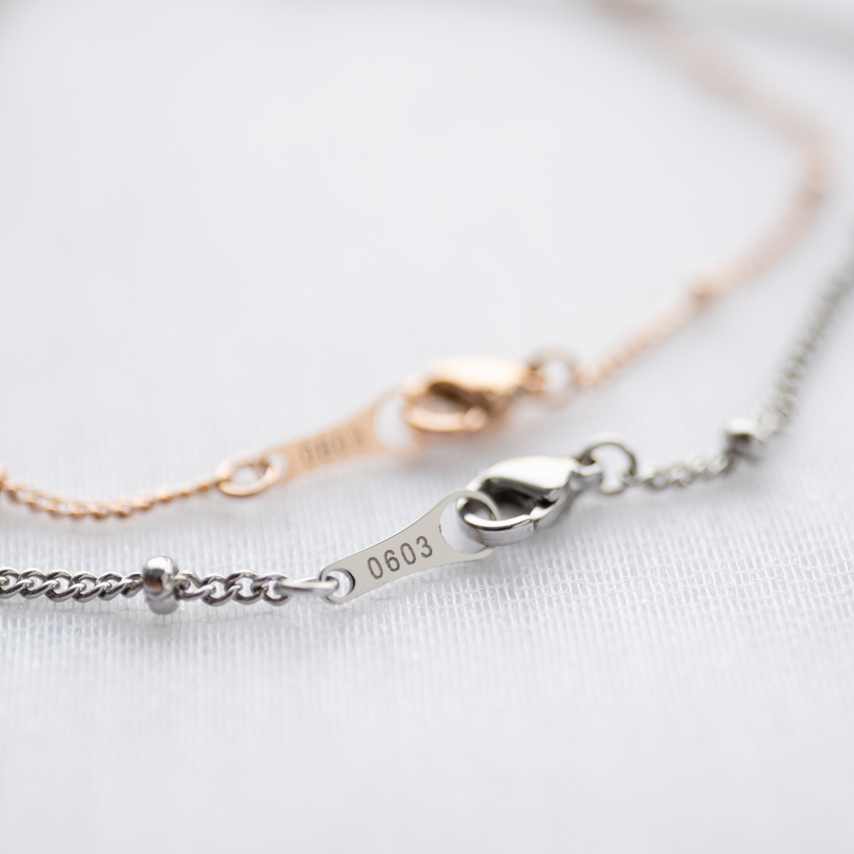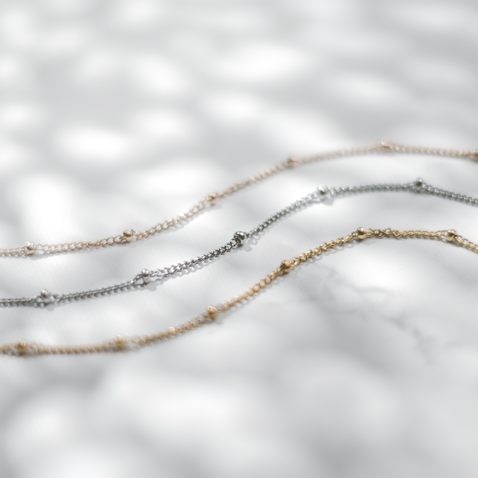 大口注文・法人のお問い合わせはこちらスタンダードな細めの喜平(カットなし)チェーンに小さなステンレスビーズをかませた、繊細でお洒落なデザインチェーンを使用したペアアンクレットです。重さが気にならず、どなたでもつけやすいようにライトな仕上がりとなっています。