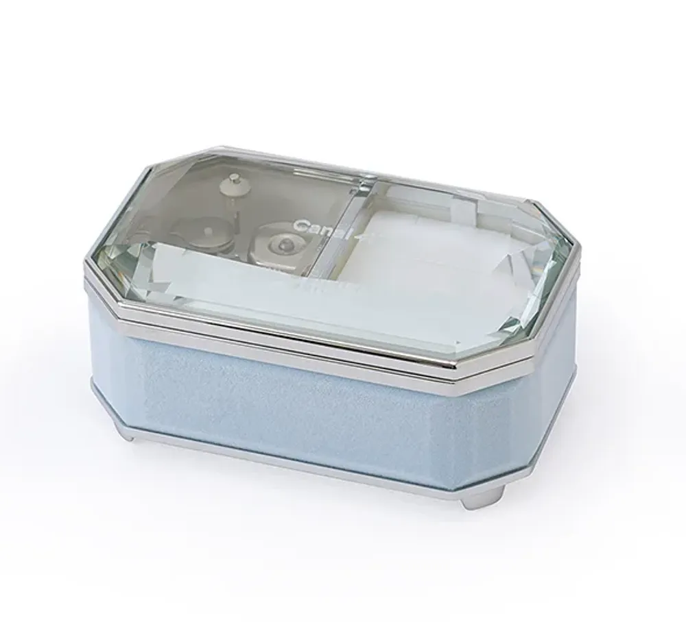 天面のカットガラスがキラキラと輝く、高級感あふれるオルゴールジュエリーケース。 肌触りの良い起毛素材で柔らかい雰囲気に。 蓋を開けると「美女と野獣/Beauty and the Beast」のメロディがジュエリーを包み込み、 大切なプレゼントをロマンティックに演出します。