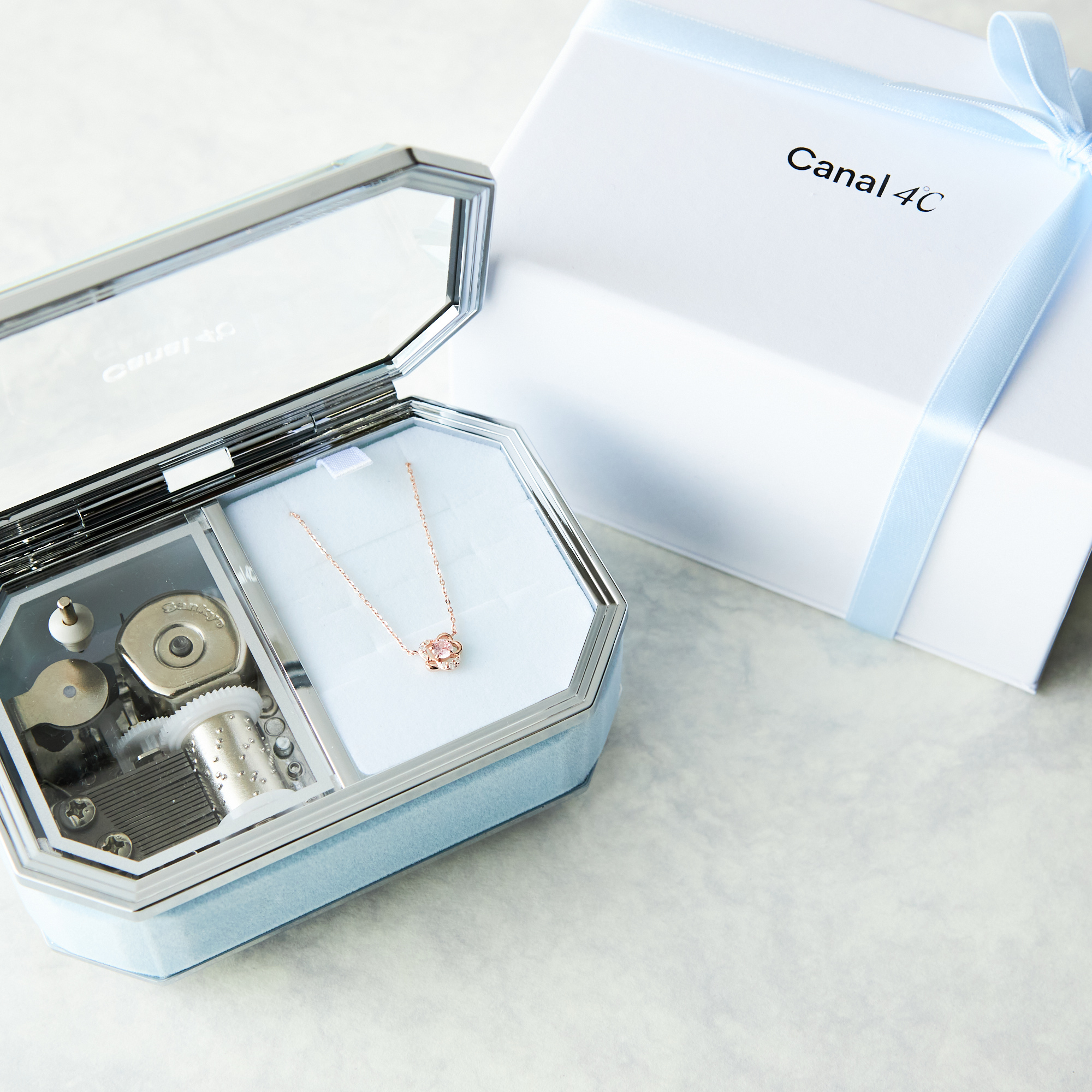 ジュエリーブランド「Canal 4℃」のタンプ限定セット。ピンクゴールドコーティングのフラワーモチーフと、輝くキュービックジルコニアが織りなすCanal4℃のシルバーネックレスに、オルゴールケースをセットにしてお届けします。蓋を開けると「美女と野獣」のメロディがジュエリーを包み込み、ロマンティックに演出します。