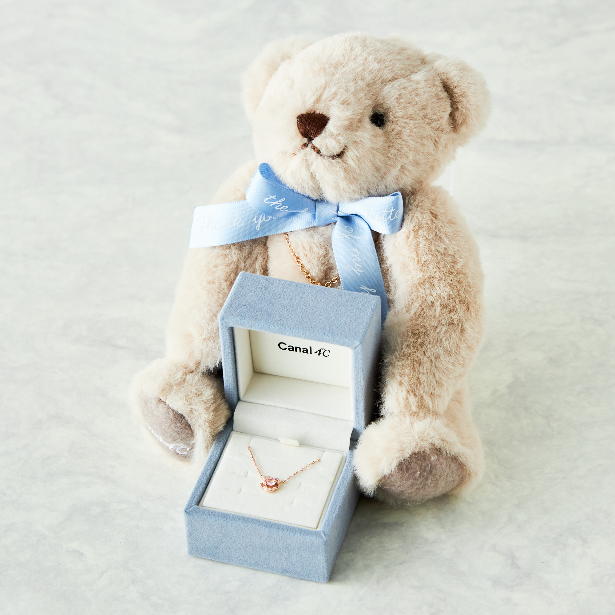 ジュエリーブランド「Canal 4℃」のタンプ限定セット。ピンクゴールドコーティングのフラワーモチーフと、輝くキュービックジルコニアが織りなすCanal4℃のシルバーネックレスは、毎日の装いにさりげない華やかさと上品な輝きをもたらします。刻印ができるチャームがついた特別なブランドオリジナルベアと一緒にお届けします。