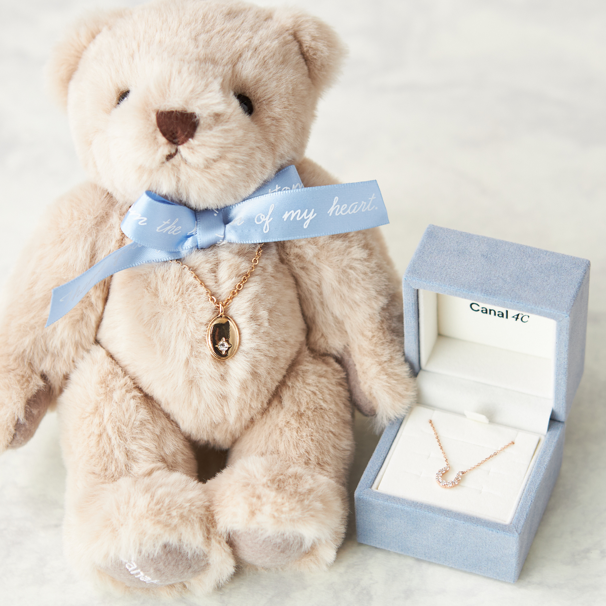 ジュエリーブランド「Canal 4℃」のタンプ限定セット。幸運を呼び込む馬蹄モチーフにストーンが煌めくネックレスは、どんな装いにもお使いいただけるデザイン。刻印ができるチャームがついた特別なブランドオリジナルベアと一緒にお届けします。