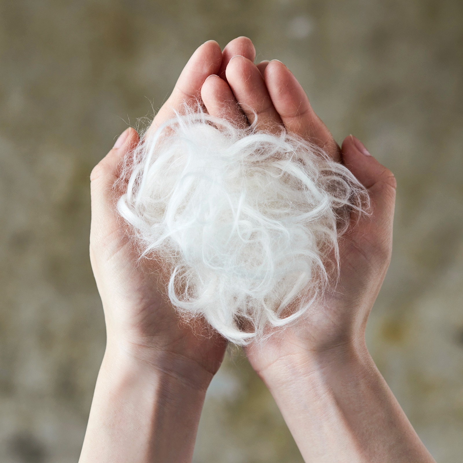 超長綿の中でも繊維長の長いものを厳選。豊富な経験をそれぞれの綿の""いいとこどり""をするのです。それは機械では測定できない、綿花の声に耳を傾けるということ。こうして選ばれた綿が「天綿」になります。