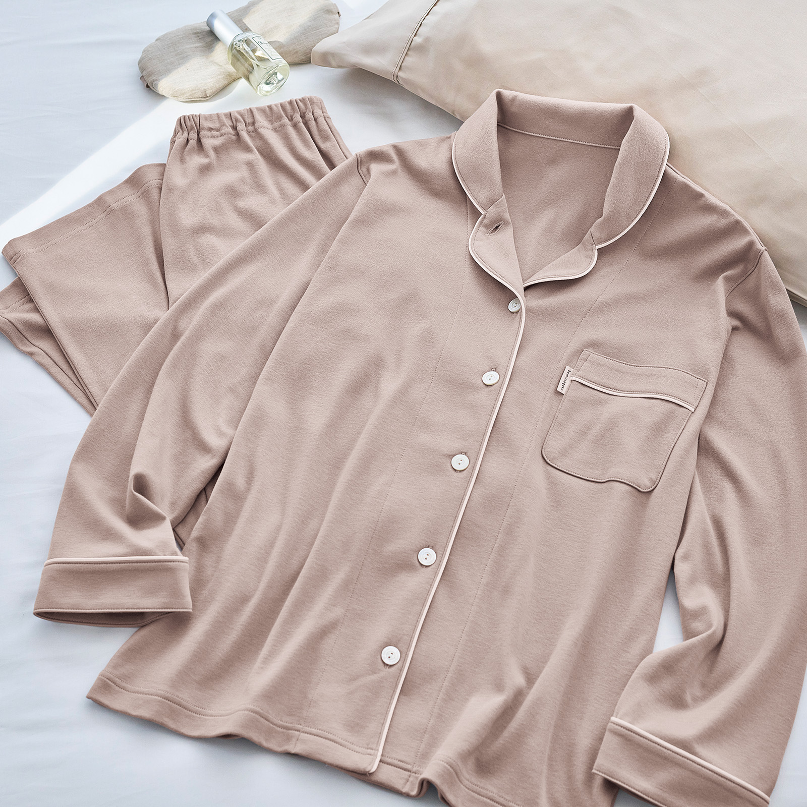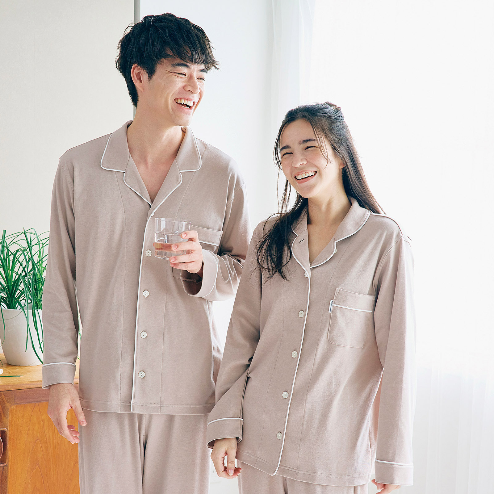 超長綿の中でも、さらに繊維長の長いものだけを厳選して紡績した、希少価値の高い「天綿」を使用。なめらかでやわらかい上質な風合いのパジャマです。 M/Lサイズよりお選びいただけます。