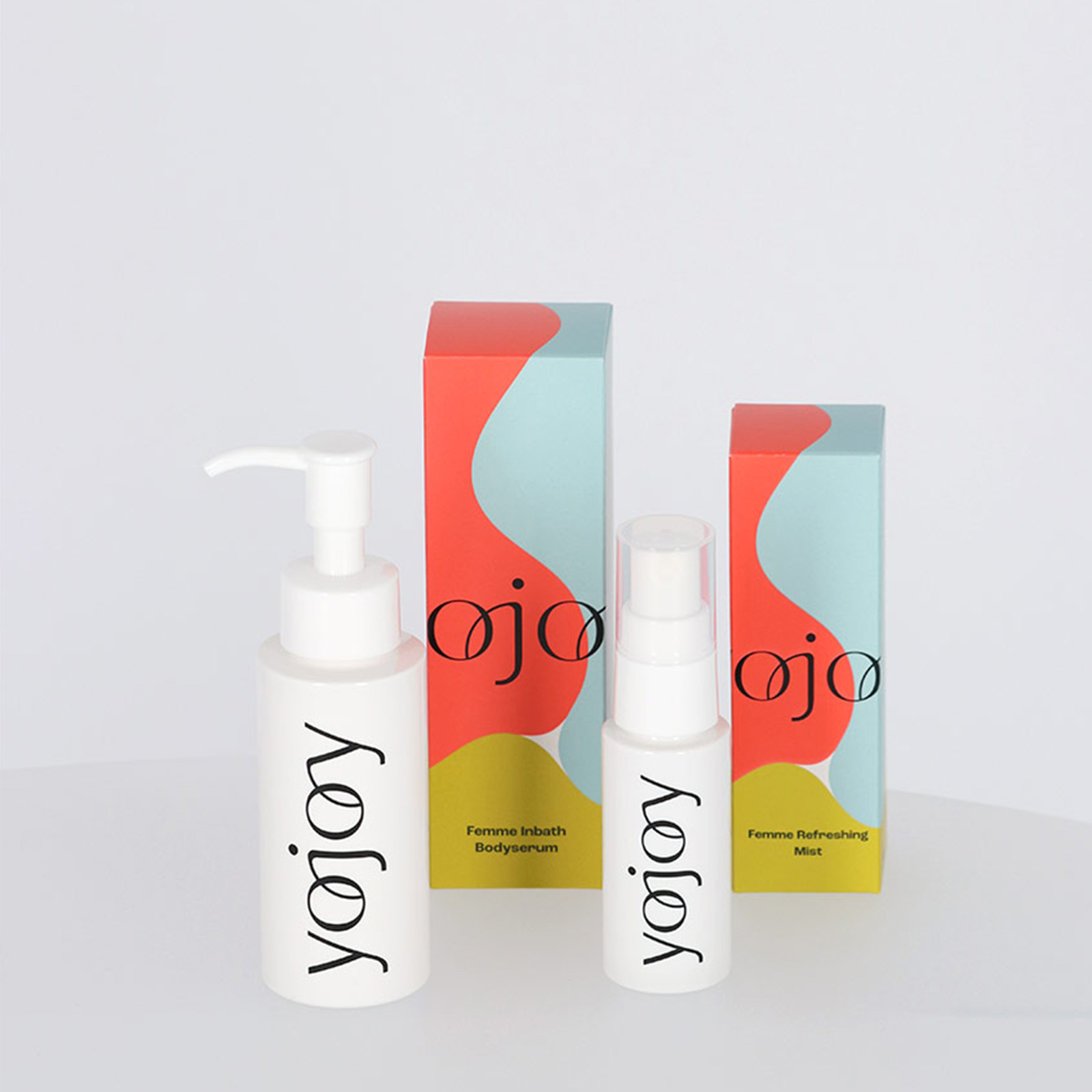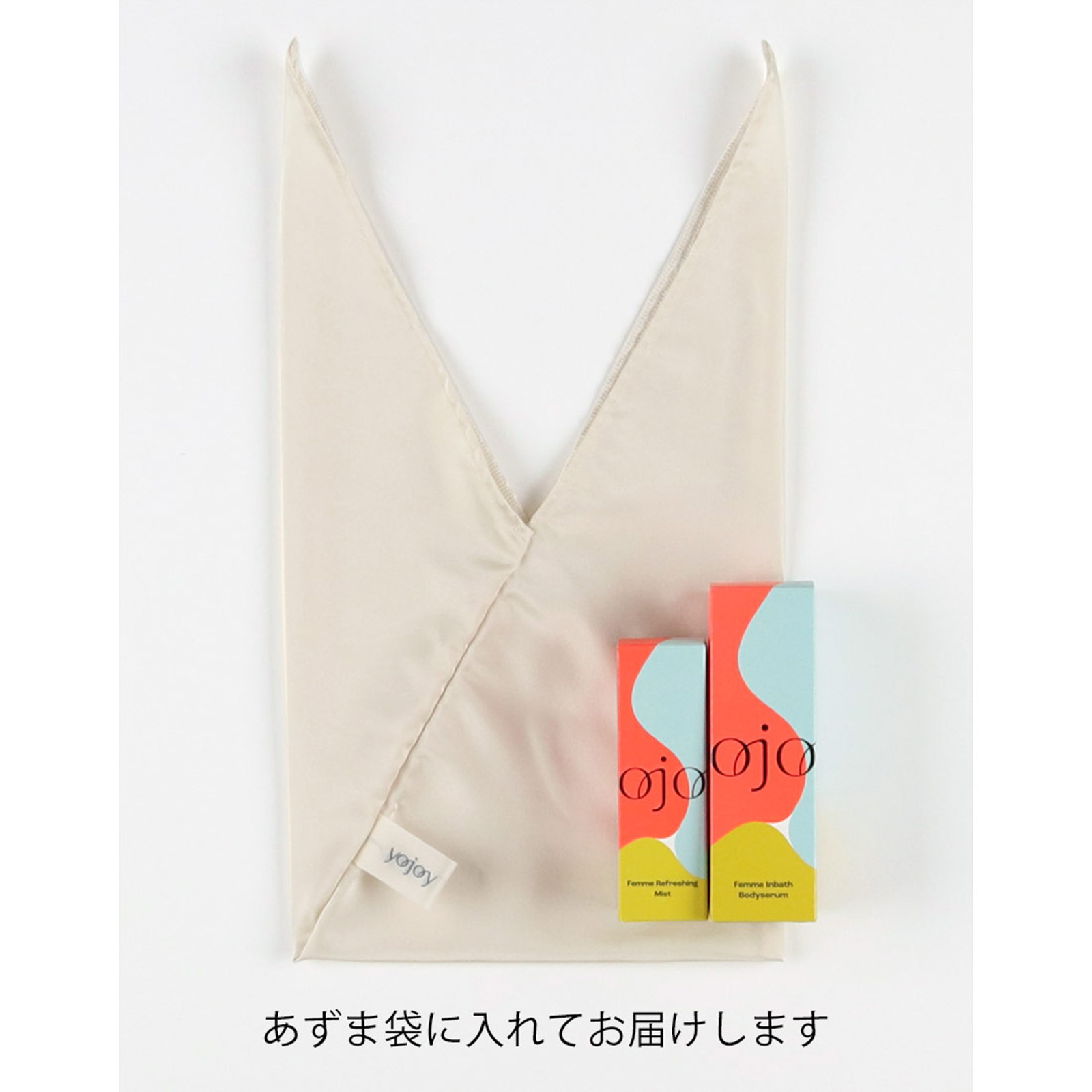 大口注文・法人のお問い合わせはこちらデリケートゾーンにも使えるフェムケアブランド「YOJOY(ヨジョイ)」のボディ用化粧品<ナリス化粧品共同開発> インバスボディセラム・リフレッシングミストの2品番をサテン地のあずま袋に入れたギフトセットです。