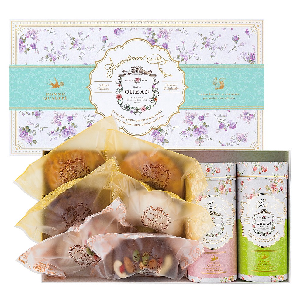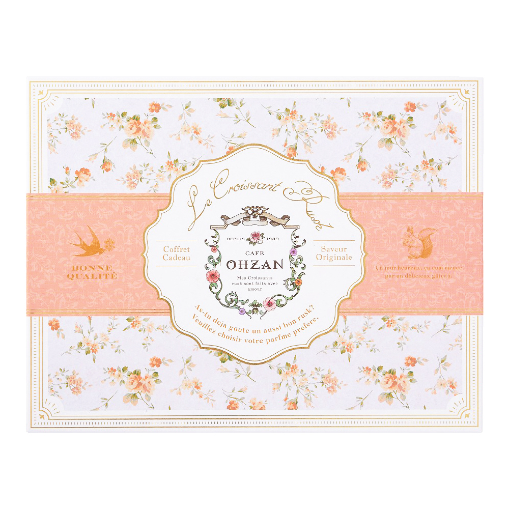 CAFE OHZANのブランドロゴと花をあしらった、華やかさと高級感のあるデザインです。贈られた方が笑顔になる大人可愛いパッケージです。