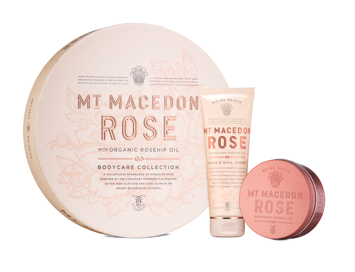 オーストラリアのボディケアブランド【MAINE BEACH】のハンド&ネイルクリームとボディムース(クリーム)が入ったセット。ローズの産地で有名なオーストラリアのビクトリア州の西に位置するマセドン山の中で特に有名なピオニーローズを使用しています。乾燥しやすい方におすすめの保湿セットです。