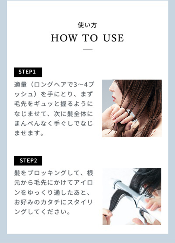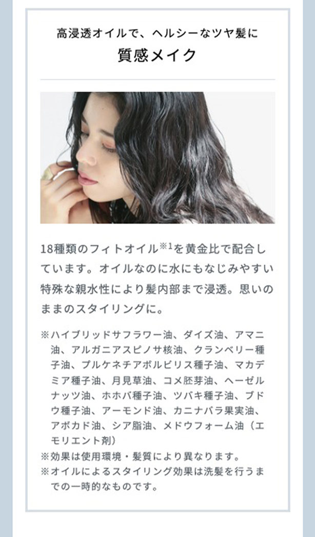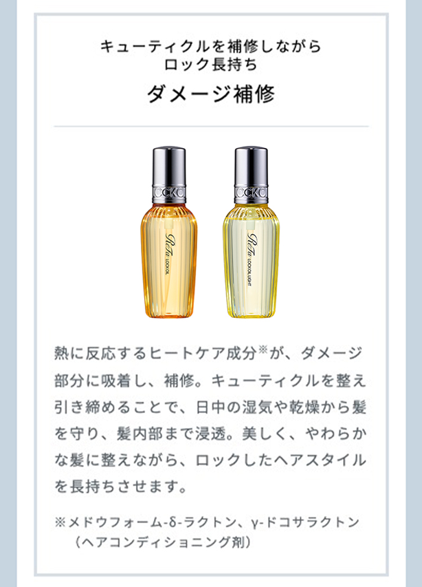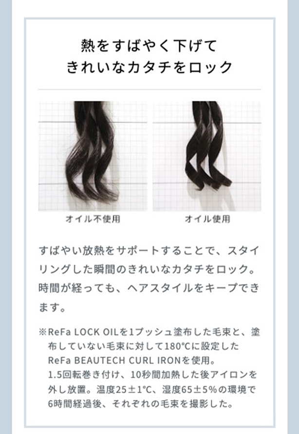 アイロン前のプレケアにおすすめなヘアオイルです。カールもストレートも時間が経ってもロックをかけたまま。