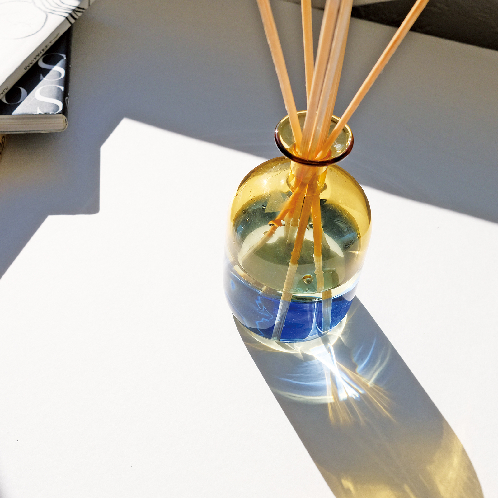大口注文・法人のお問い合わせはこちら懐かしさを感じるやわらかいフォルムと、透明感のあるバイカラーのガラスが目をひくリードディフューザー。 精油ベースのやさしく香るアロマが心をくすぐります。 何個も並べたくなる、インテリアにちょうどいいサイズ感もポイント。