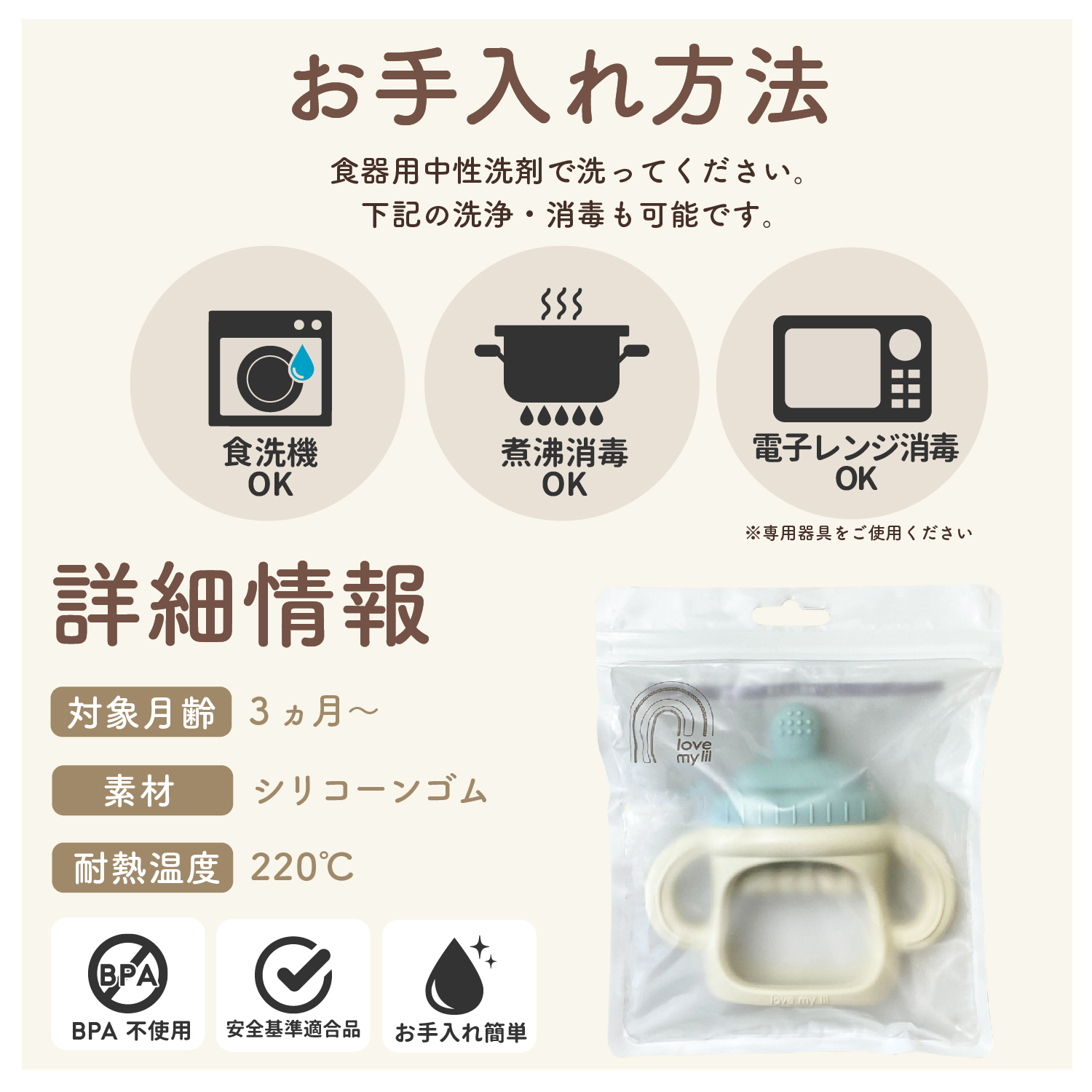 | お手入れ方法 | 食器用中性洗剤で洗ってください。 食洗機上段OK。 煮沸、電子レンジ消毒OK。 |