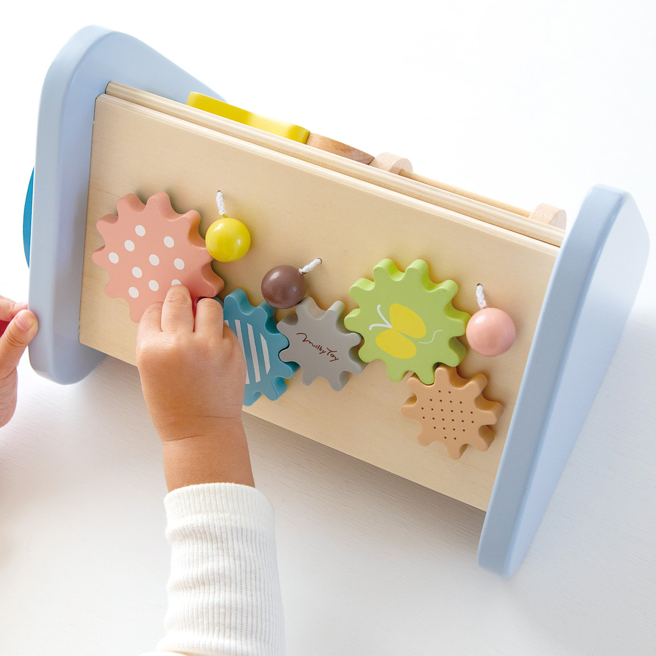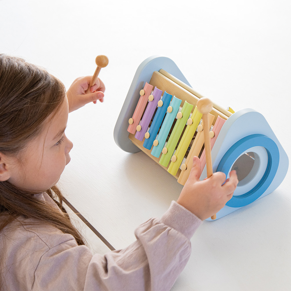大口注文・法人のお問い合わせはこちら鉄琴・ドラムを「たたく」、ラトル・歯車を「回す」、ギロを「こする」という動作から音が出る楽しさを自分で発見し、音の違いも自然に理解していきます。 音を奏でるための色んな手の動きで指先の器用性を育みます。