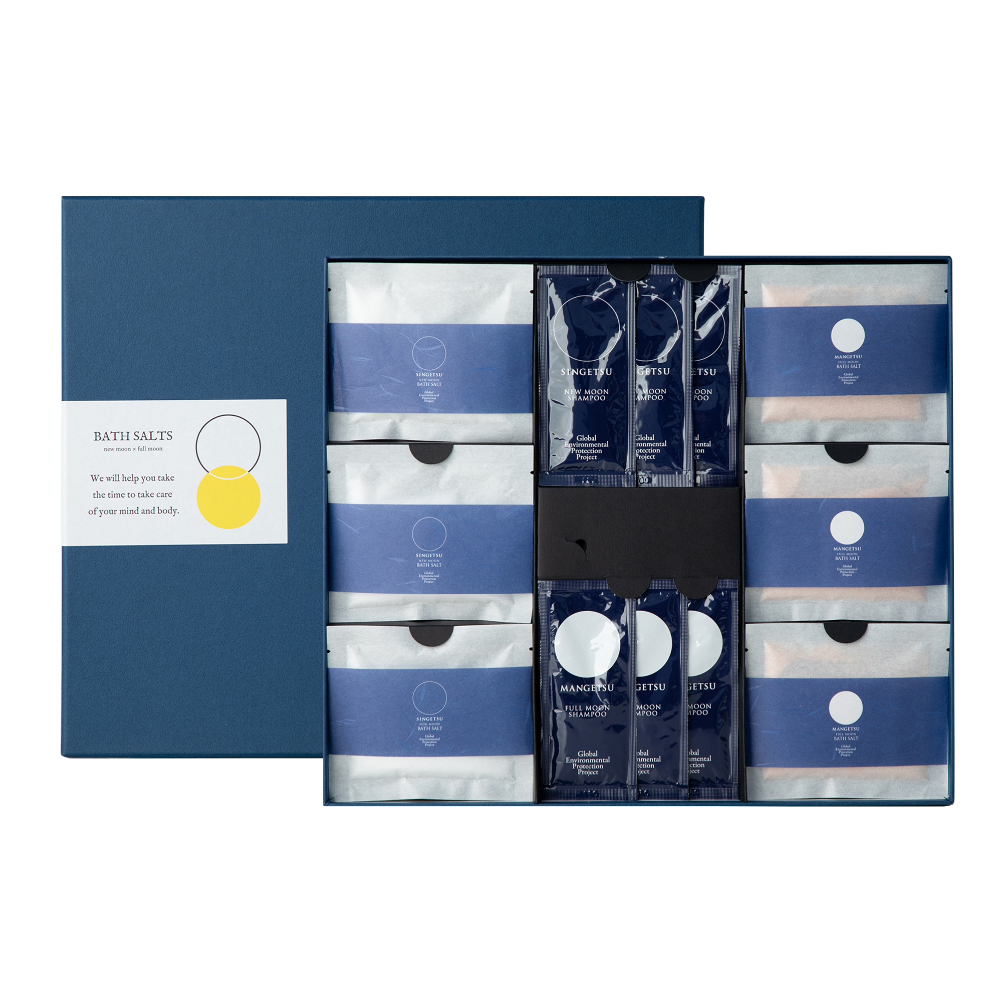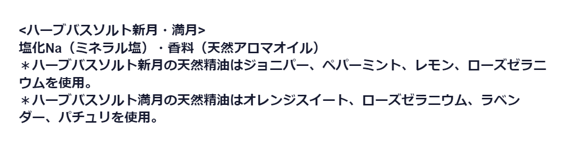 | 内容量/内容物 | ハーブバスソルト新月 30g×3枚、ハーブバスソルト満月 30g×3枚、新月シャンプー10mL×3枚、満月シャンプー10mL×3枚、製品案内カード1枚、ギフト箱大 |
