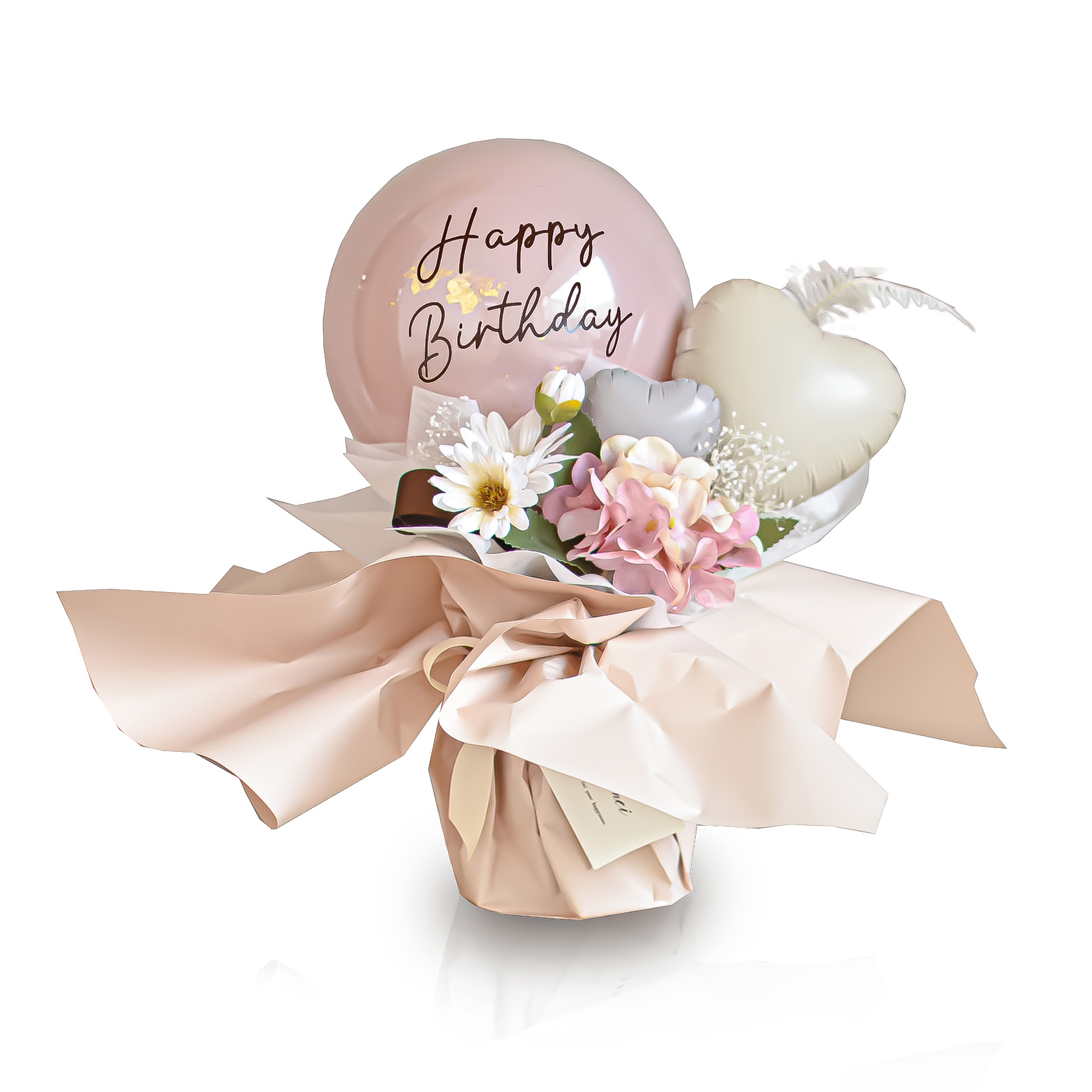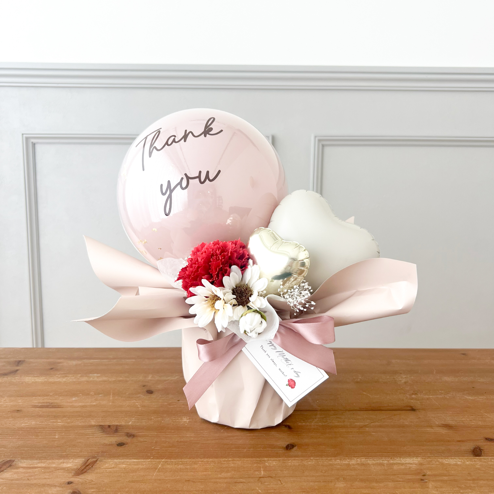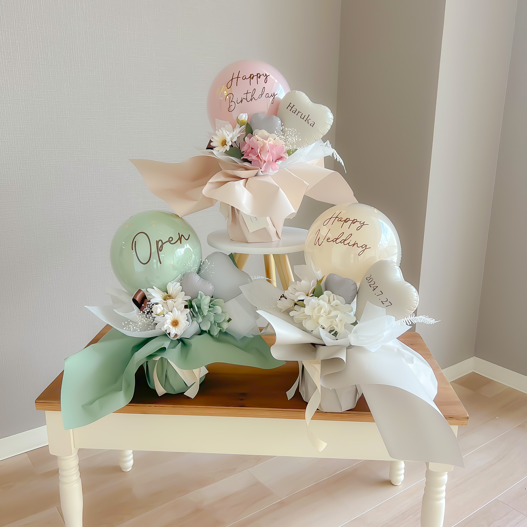 くすみカラーのバルーンとお花ををふんわり詰め込んだ、華やかで心温まるギフト。