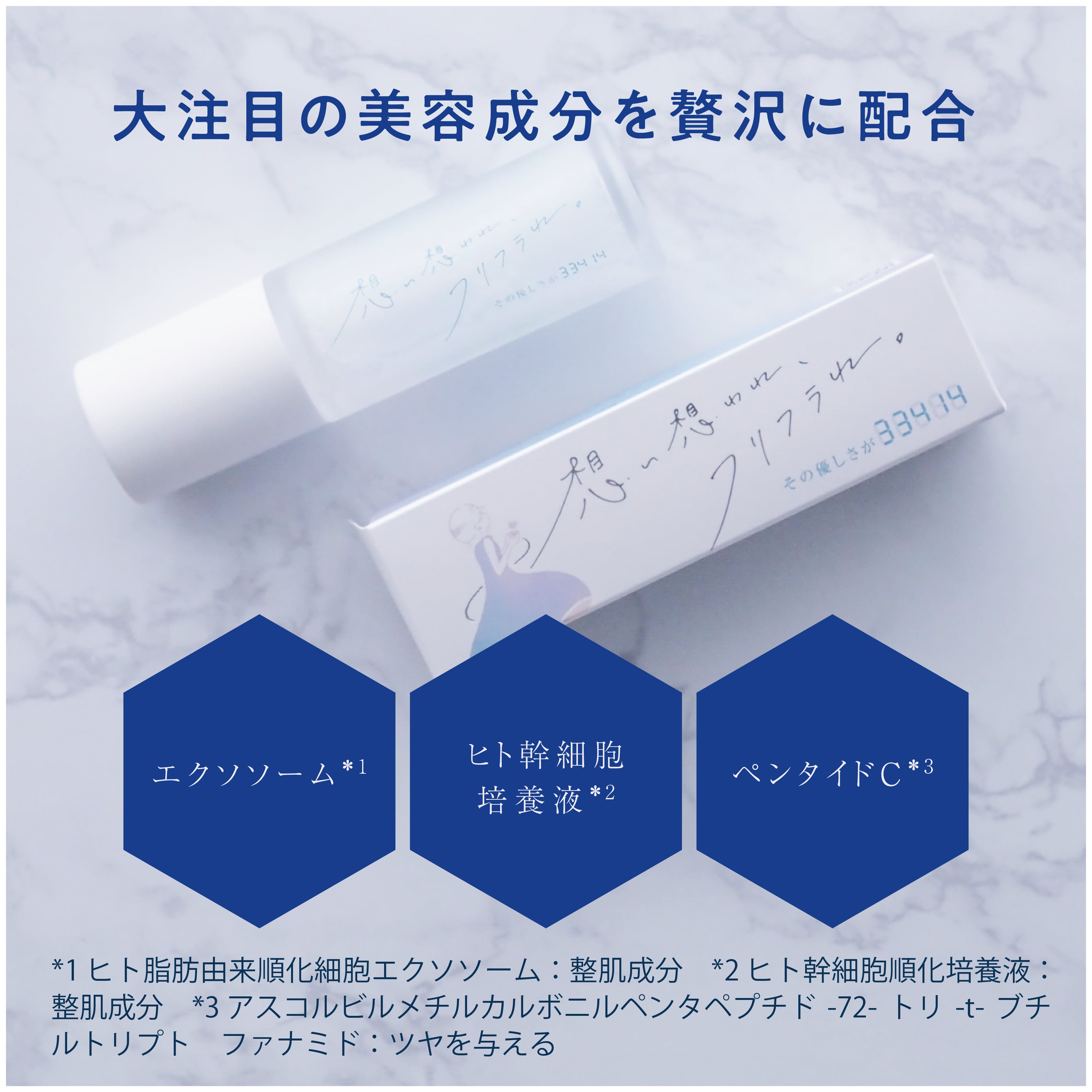 大口注文・法人のお問い合わせはこちら次世代美容成分「エクソソーム*1」とリポソーム化された「ヒト幹細胞培養液*2」をダブルで配合。 さらりとしたテクスチャなのに肌にしっとりなじむ。 「補うスキンケア」ではなく、ヒアルロン酸やコラーゲンを作り出す力を整える「次世代土台*3ケア」。 肌のターンオーバーを整え、あなた本来のみずみずしいうるおい満ちた肌へとサポートします。 *1 ヒト脂肪由来順化細胞エクソソーム:整肌成分 *2 ヒト幹細胞順化培養液:整肌成分 *3 角層まで