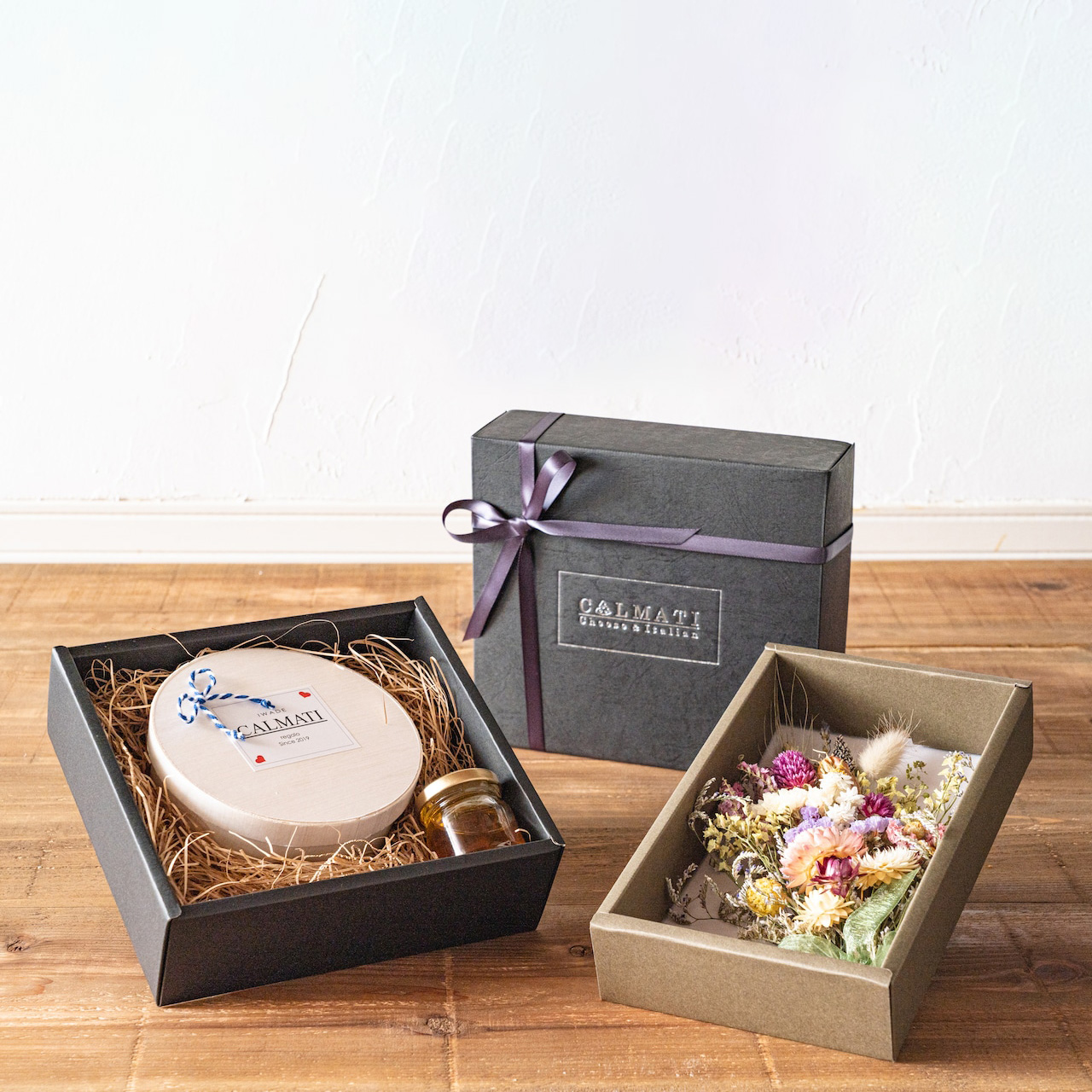 大口注文・法人のお問い合わせはこちらそのまま飾れるボックスに入ったドライフラワーのブーケと濃厚チーズケーキを一緒に贈れる、見た目にも味わい的にも満足間のある組み合わせ。誕生日や母の日に大人気。 ドライフラワーが入っているボックスの台紙にはお好きなメッセージを入れる事ができるので、思いを伝える事ができます。チーズケーキを食べながらお花を観賞するなんて時間の過ごし方も素敵ですね。