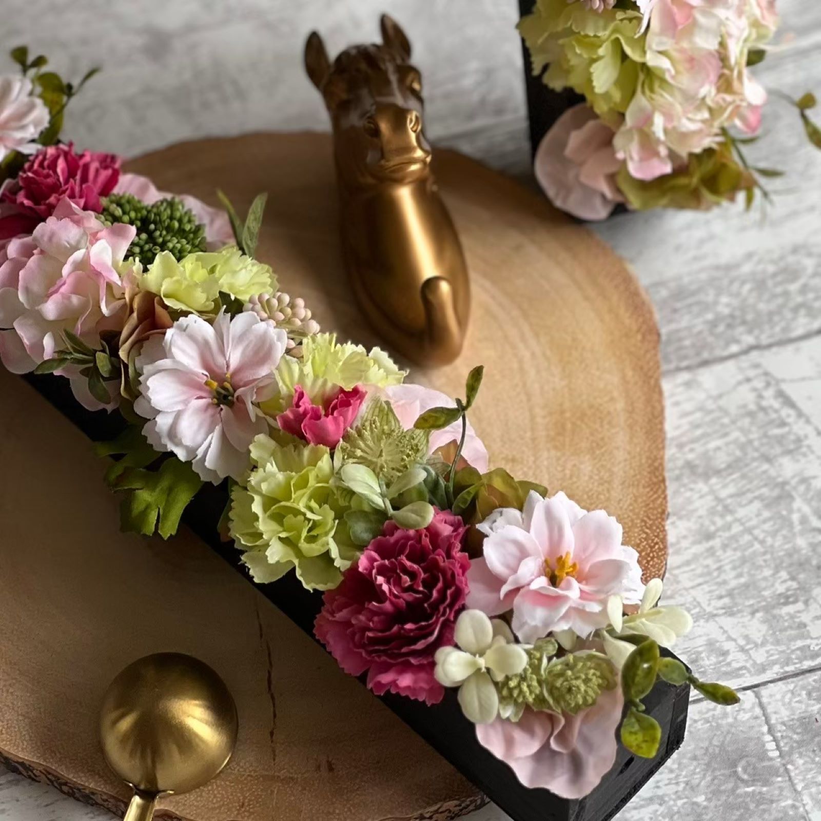 | アーティフィシャルフラワー | ■素材/原材料 アーティフィシャルフラワー、木製ボックス、オアシス(インテリア) ■サイズ 幅100mmX縦300mmX高さ90mm(2個) ■お手入れ方法 ・ほこりや汚れは、ハケや濡れタオルで表面を優しくふき取ってください。 ・アレンジしてあるお花を引っ張りますと抜けてしまうことがあります。優しくお取り扱いください。 ■ご使用上/安全上の注意 ・直射日光や照明が強く当たる場所や雨風の当たる屋外でのご使用は避けてください。 ・暖房器具などのそばに置かないでください。 ・置き場所によっては、家具や飾っている場所の塗料と反応し、家具や壁紙が反応してしまう事がありますので、長い期間、付着して飾ることは、避けていただきますようお願いいたします。 ・お花は厳選しておりますが、花びらの癖や繊維などが出ることがあります。これは素材の性質上ですので、ご理解のほど、よろしくお願いいたします。 |