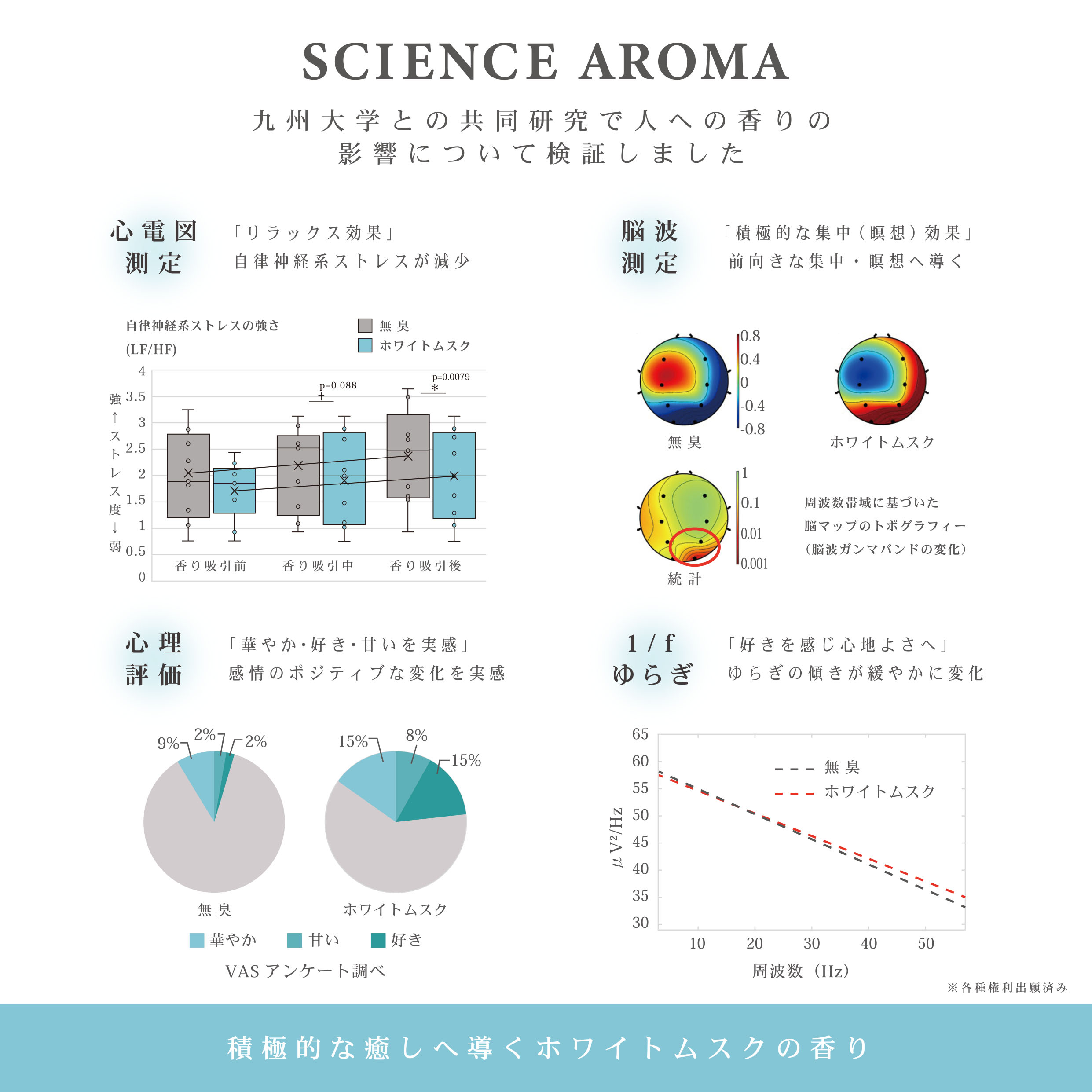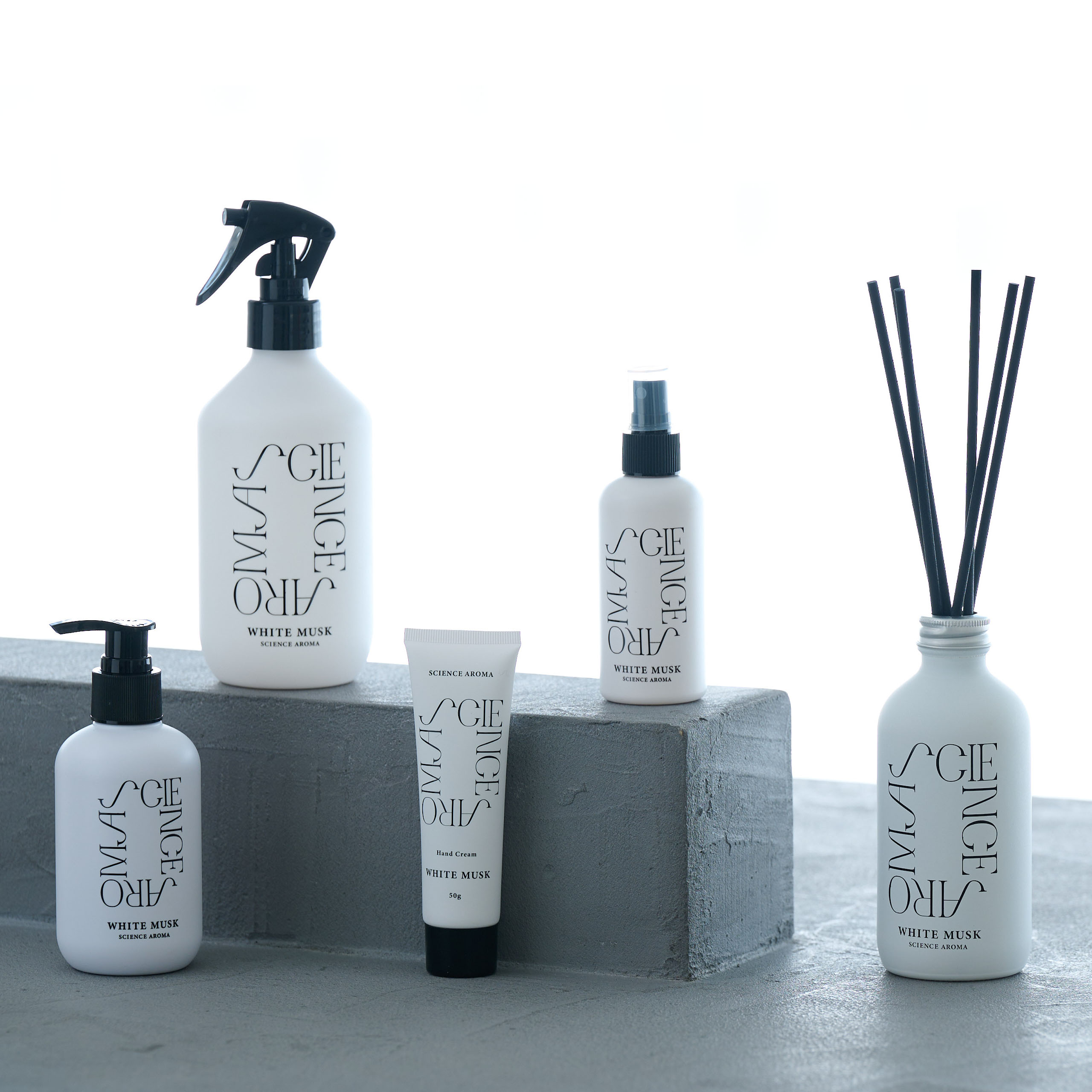香りの効果・効能について科学的にアプローチするブランド『サイエンスアロマ』。 第一弾はポピュラーな香りとして人気のあるホワイトムスクを独自のレシピで作成しました。 九州大学と共同研究により香料を詳しく分析し The Next Day Inc.が開発したブランドです。