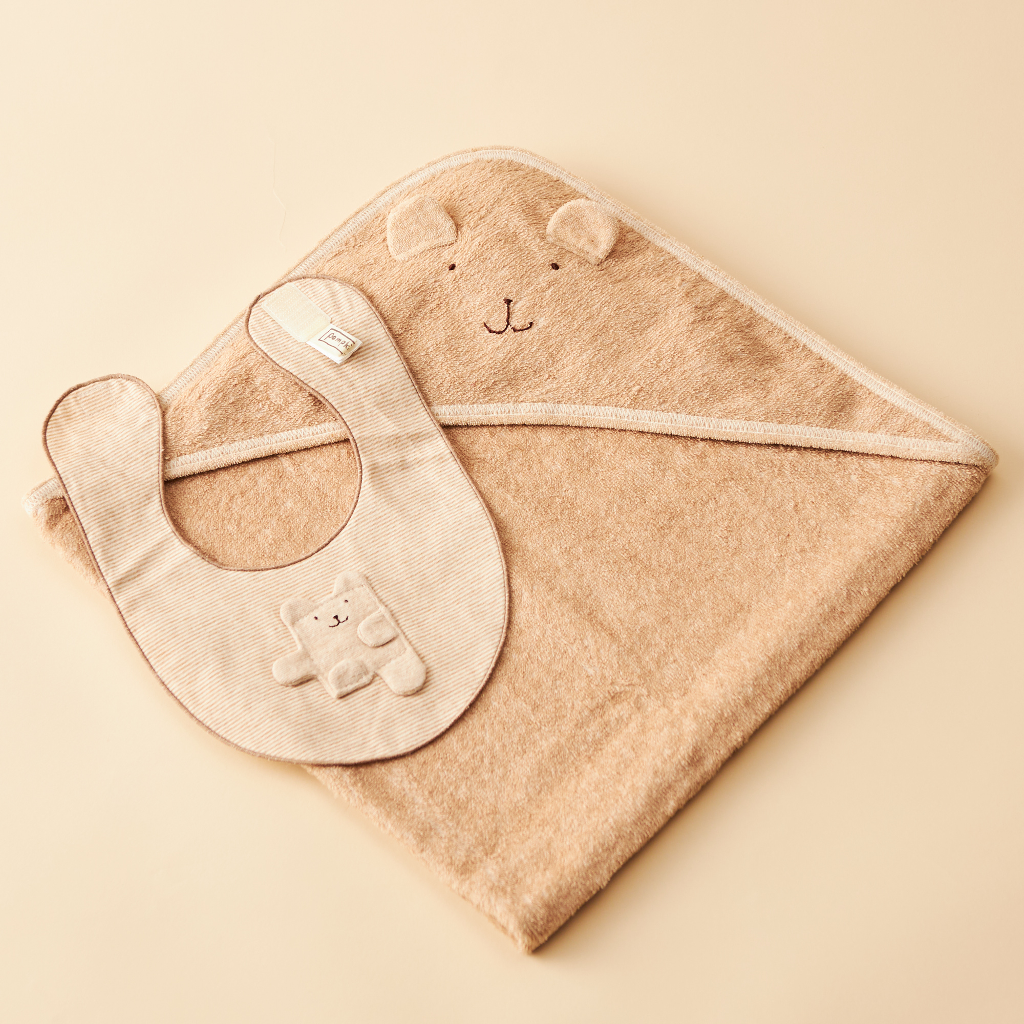 大口注文・法人のお問い合わせはこちら三角フードをあたまにかぶせるとかわいいくまさんに変身できちゃうアフガンと何枚あっても嬉しいスタイの入ったギフトセットです。 両面パイル生地を使用した吸水性のよいやわらかな肌触りのアフガン。水遊びやお風呂上りに。楽しくスキップしているくまのモチーフがついたかわいいスタイもお肌にやさしい素材オーガニックコットンを使用しています。
