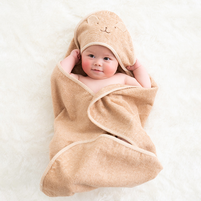 両面パイルで吸水性の良いやわらかな肌触りのアフガン。 三角フードを赤ちゃんにかぶせてあげれば、耳がピョンと 立って、かわいらしさが際立ちます。 水遊びの後、お風呂上がり、ねんねの時などいろいろ使えます。