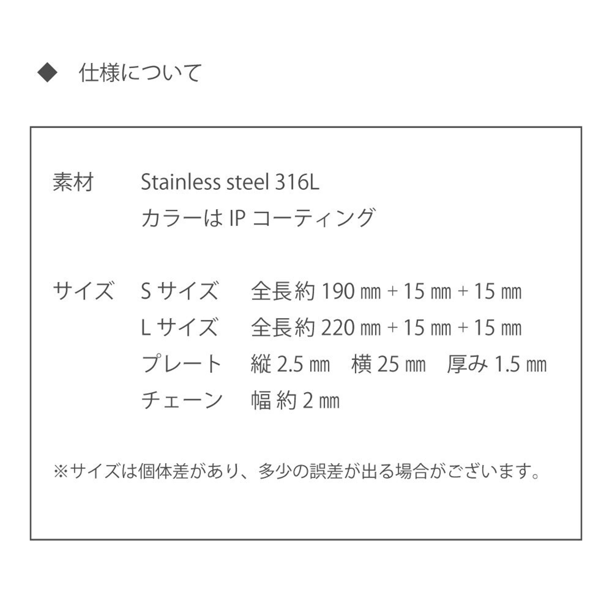 | サイズ | Sサイズ 全長約190mm+15mm+15mm Lサイズ 全長約220mm+15mm+15mm プレート 縦2.5mm 横25mm 厚み1.5mm チェーン 幅約2mm |