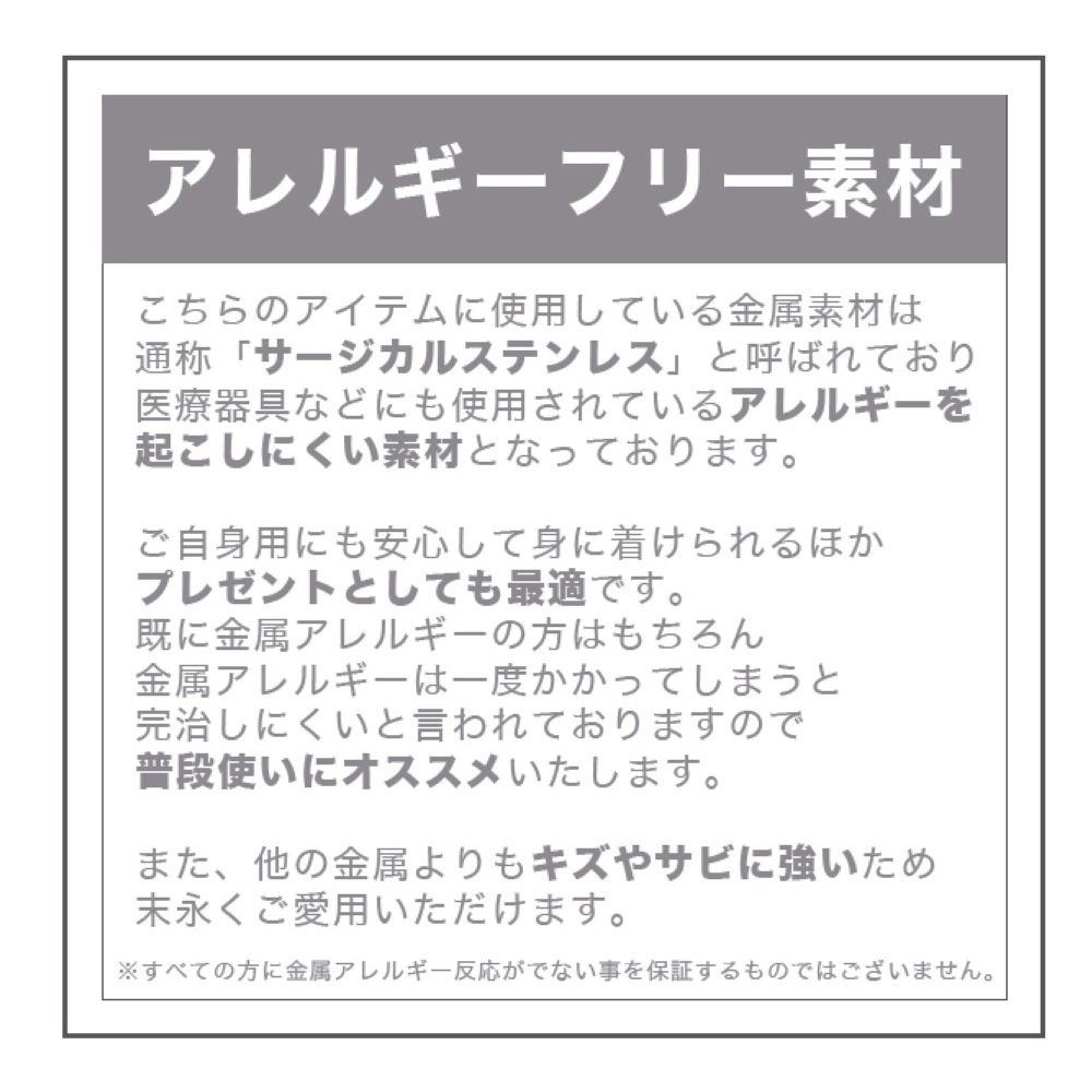 | 金属アレルギー対応か | アレルギーフリー素材 こちらのアイテムに使用している金属素材は 通称「サージカルステンレス」と呼ばれており 医療器具などにも使用されているアレルギーを 起こしにくい素材となっております。 ご自身用にも安心して身に着けられるほか プレゼントとしても最適です。 既に金属アレルギーの方はもちろん 金属アレルギーは一度かかってしまうと 完治しにくいと言われておりますので 普段使いにオススメいたします。 また、他の金属よりもキズやサビに強いため 末永くご愛用いただけます。 ※すべての方に金属アレルギー反応がでない事を保証するものではございません。 |