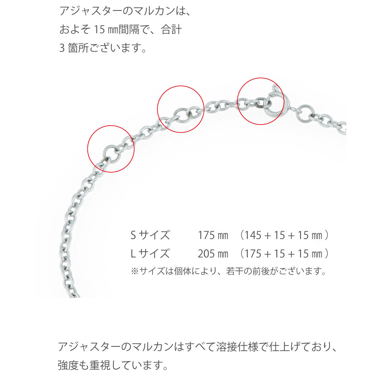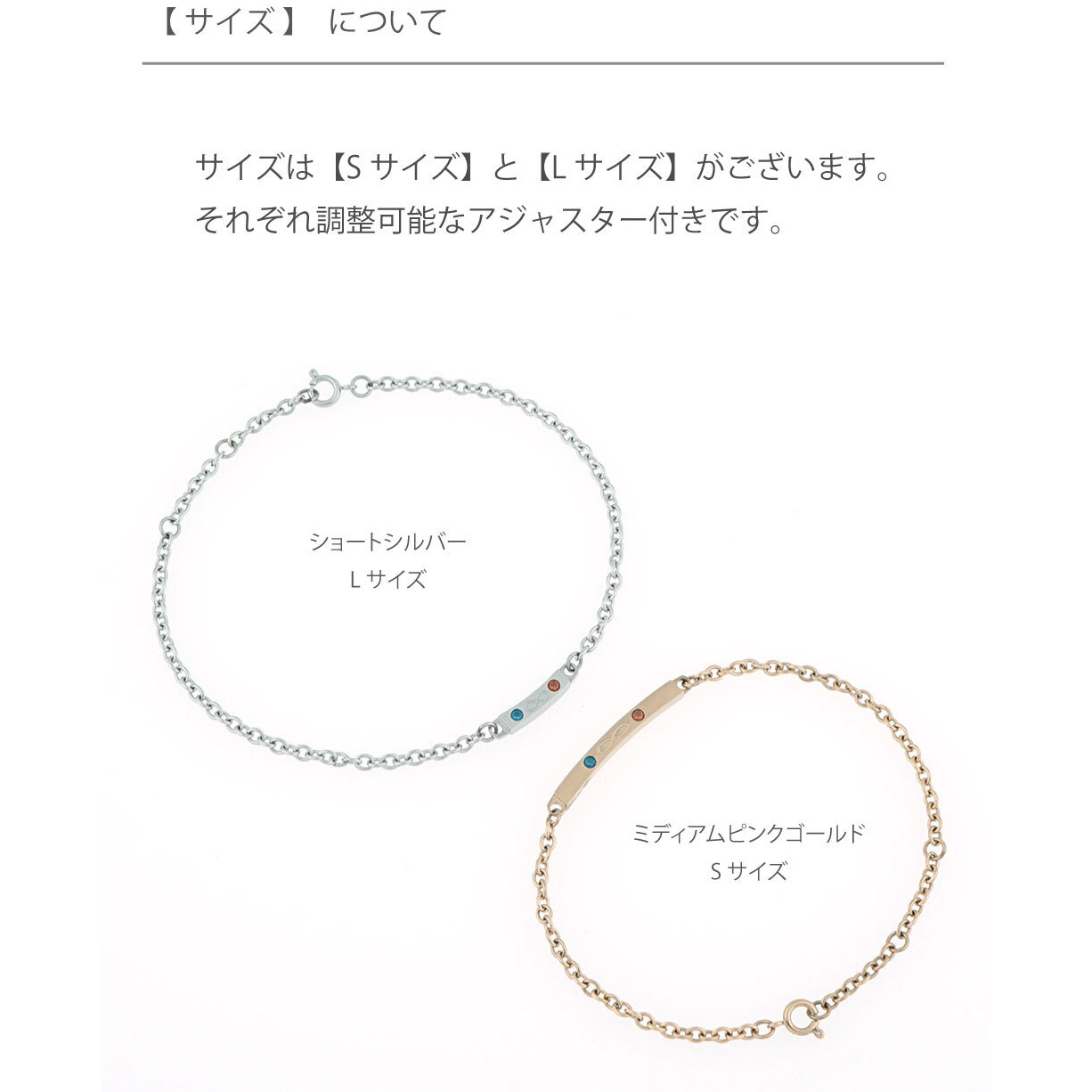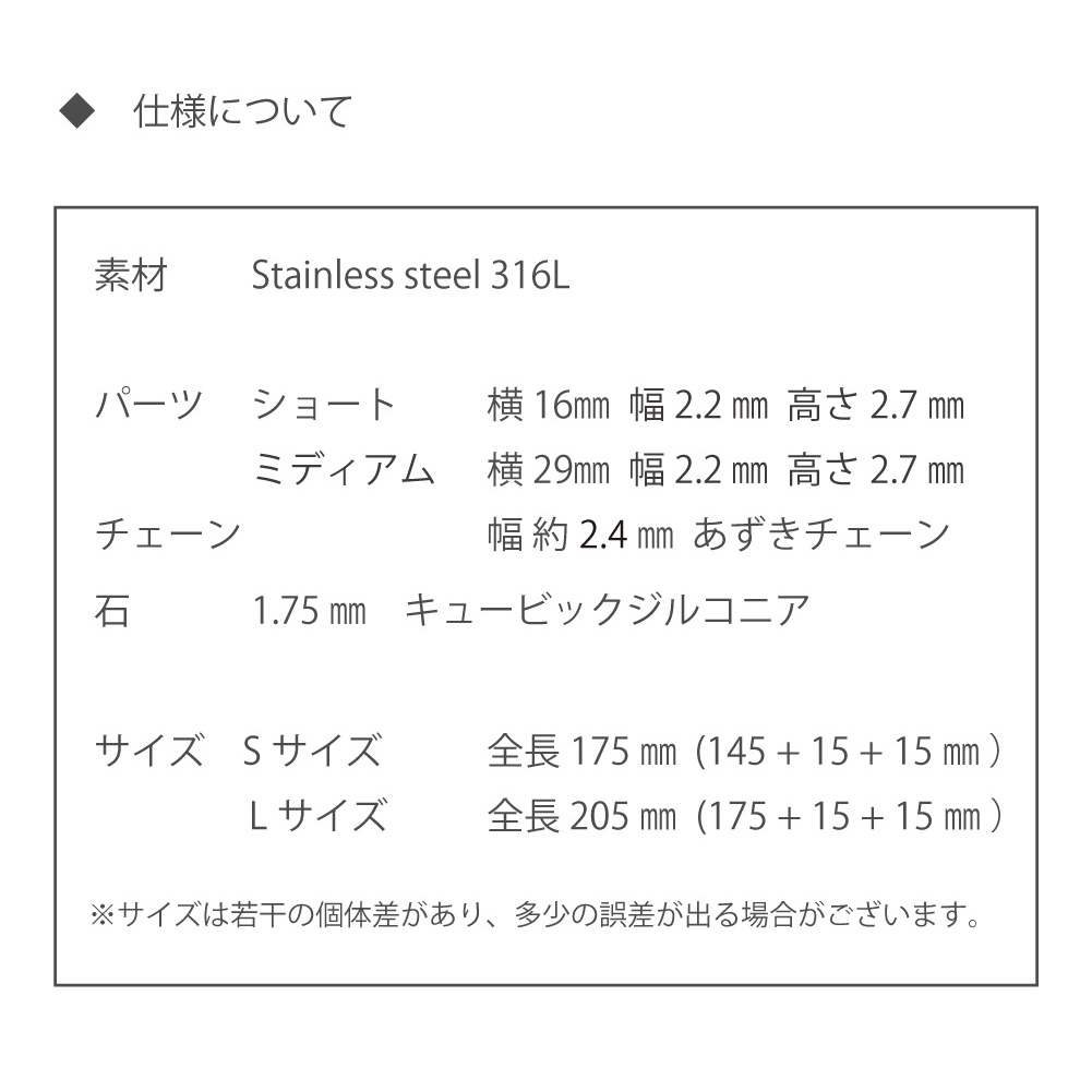 | サイズ | パーツ ショート 横16mm 幅2.2mm 高さ2.7mm ミディアム 横29mm 幅2.2mm 高さ2.7mm チェーン 幅約2.4mm あずきチェーン 石 1.75mm キュービックジルコニア サイズ Sサイズ 全長約175mm (145mm + 15mm + 15mm) Lサイズ 全長約205mm (175mm + 15mm + 15mm) |