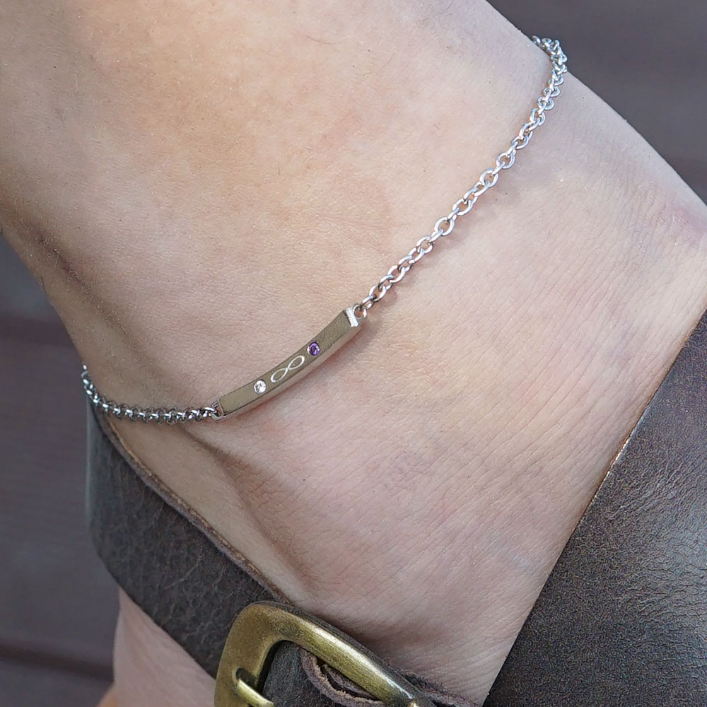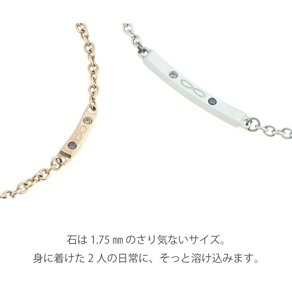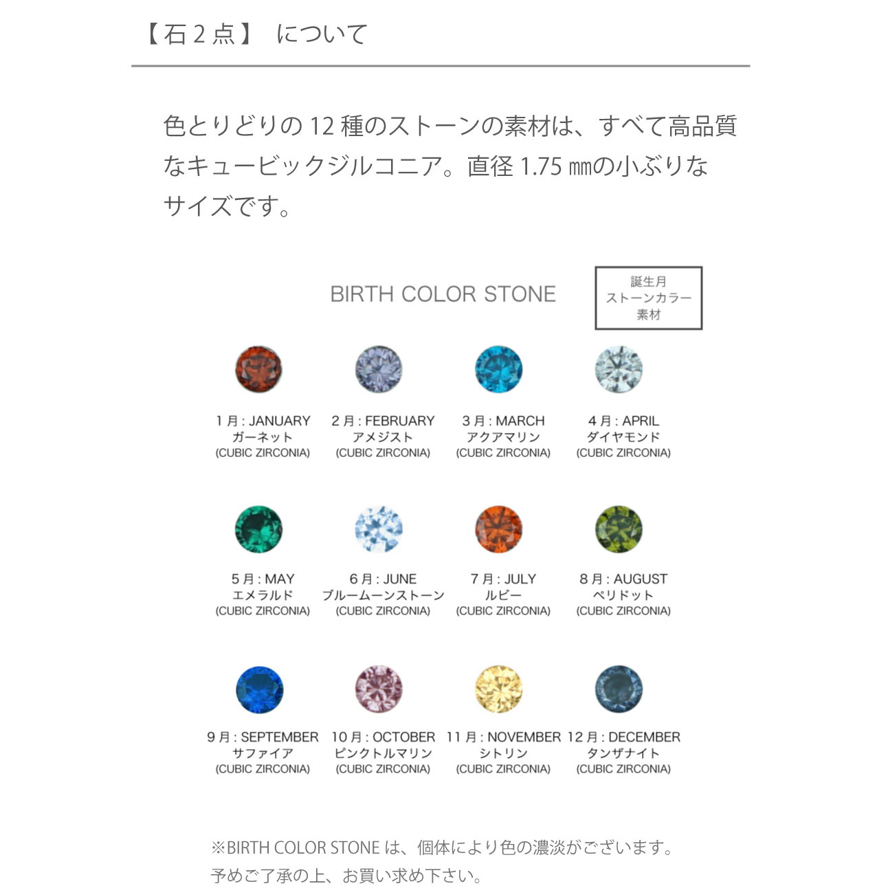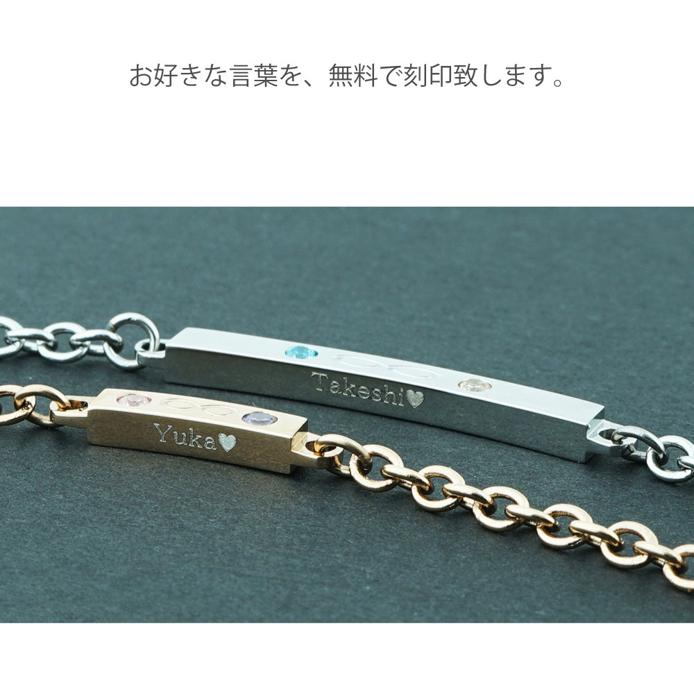2人を象徴するような、2石の誕生月カラーストーンを、それぞれのお好きなパーツに石留めいたします。石は1.75mm のさり気ないサイズ。身に着ける人の日常に、 そっと溶け込みます。お好きな言葉を、無料で刻印いたします。