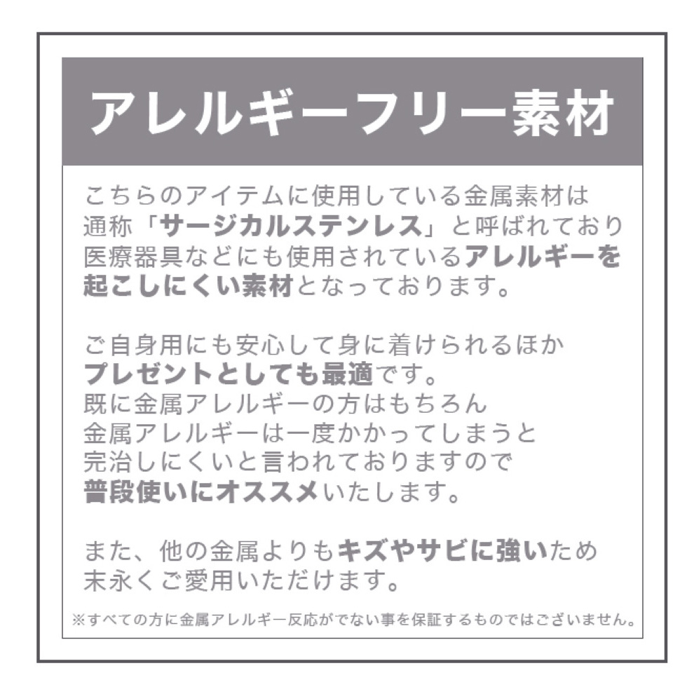 | 金属アレルギー対応か | アレルギーフリー素材 こちらのアイテムに使用している金属素材は通称「サージカルステンレス」と呼ばれており医療器具などにも使用されているアレルギーを起こしにくい素材となっております。 ご自身用にも安心して身に着けられるほかプレゼントとしても最適です。 既に金属アレルギーの方はもちろん、金属アレルギーは一度かかってしまうと完治しにくいと言われておりますので普段使いにおすすめいたします。 また、他の金属よりもキズやサビに強いため末永くご愛用いただけます。 ※すべての方に金属アレルギー反応がでない事を保証するものではございません。 |