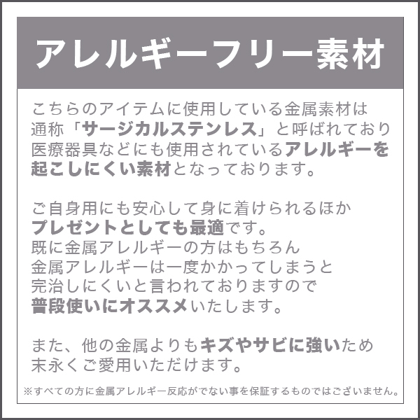 | 金属アレルギー対応か | アレルギーフリー素材 こちらのアイテムに使用している金属素材は通称「サージカルステンレス」と呼ばれており医療器具などにも使用されているアレルギーを起こしにくい素材となっております。 ご自身用にも安心して身に着けられるほかプレゼントとしても最適です。 既に金属アレルギーの方はもちろん、金属アレルギーは一度かかってしまうと完治しにくいと言われておりますので普段使いにおすすめいたします。 また、他の金属よりもキズやサビに強いため末永くご愛用いただけます。 ※すべての方に金属アレルギー反応がでない事を保証するものではございません。 |