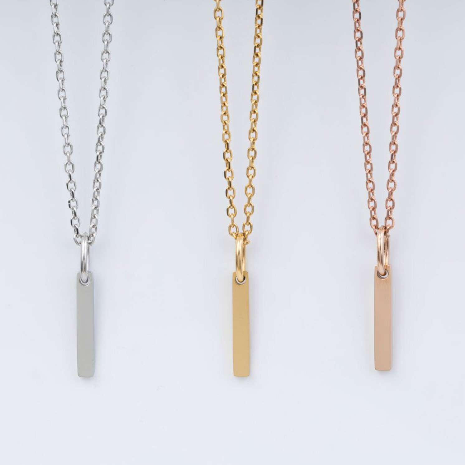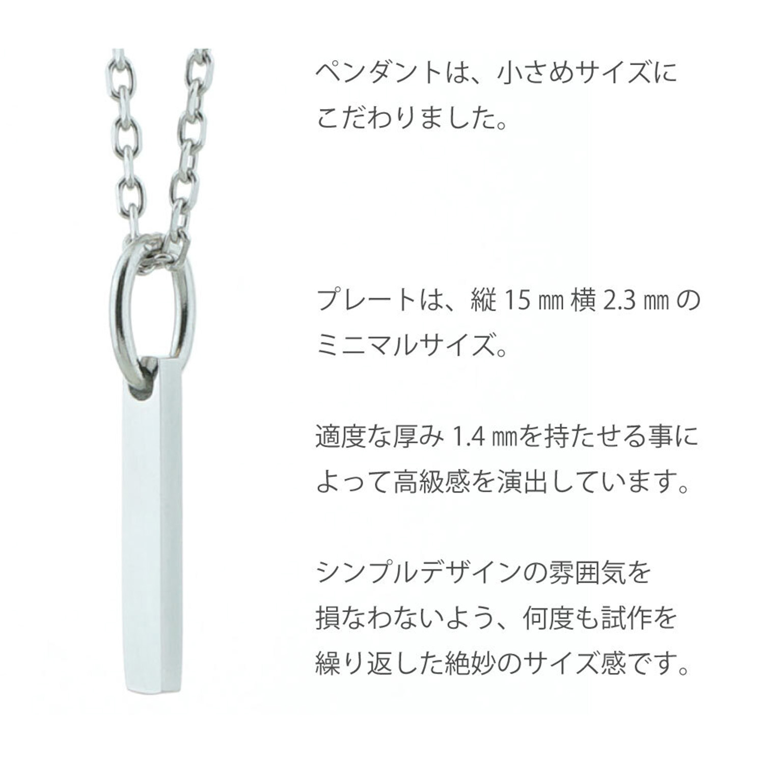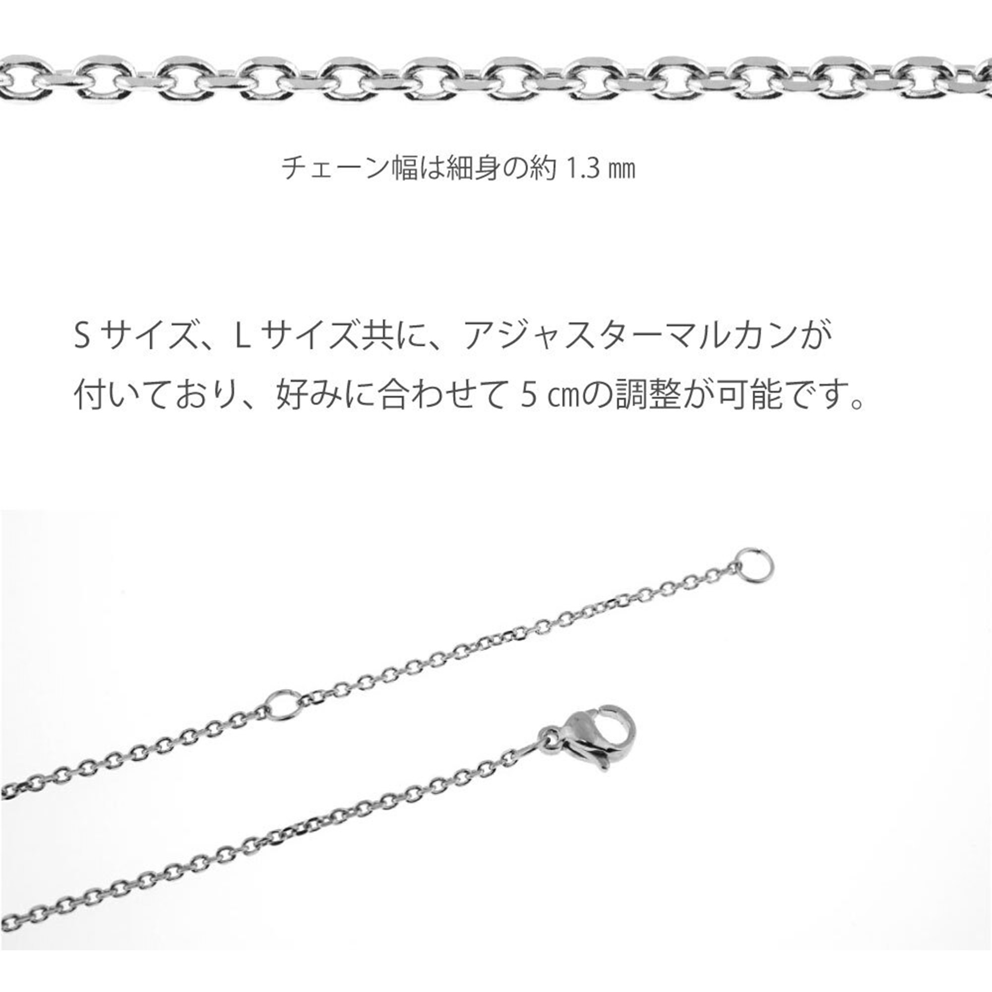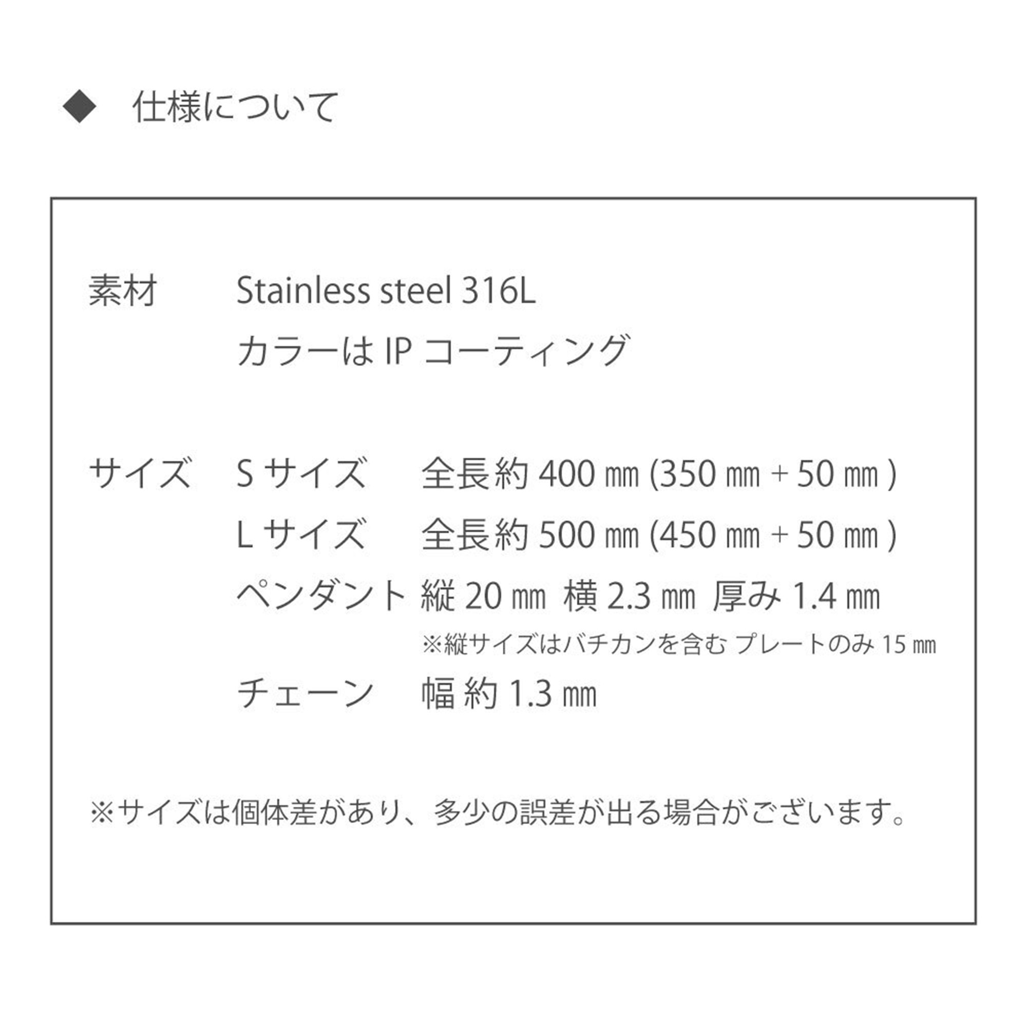 | サイズ | Sサイズ 全長約400mm (350mm + 50 mm) Lサイズ 全長約500mm (450mm + 50 mm) ペンダント 縦20mm 横2.3mm 厚み1.4mm ※縦サイズはバチカンを含む プレートのみ 15mm チェーン 幅約 1.3 mm |