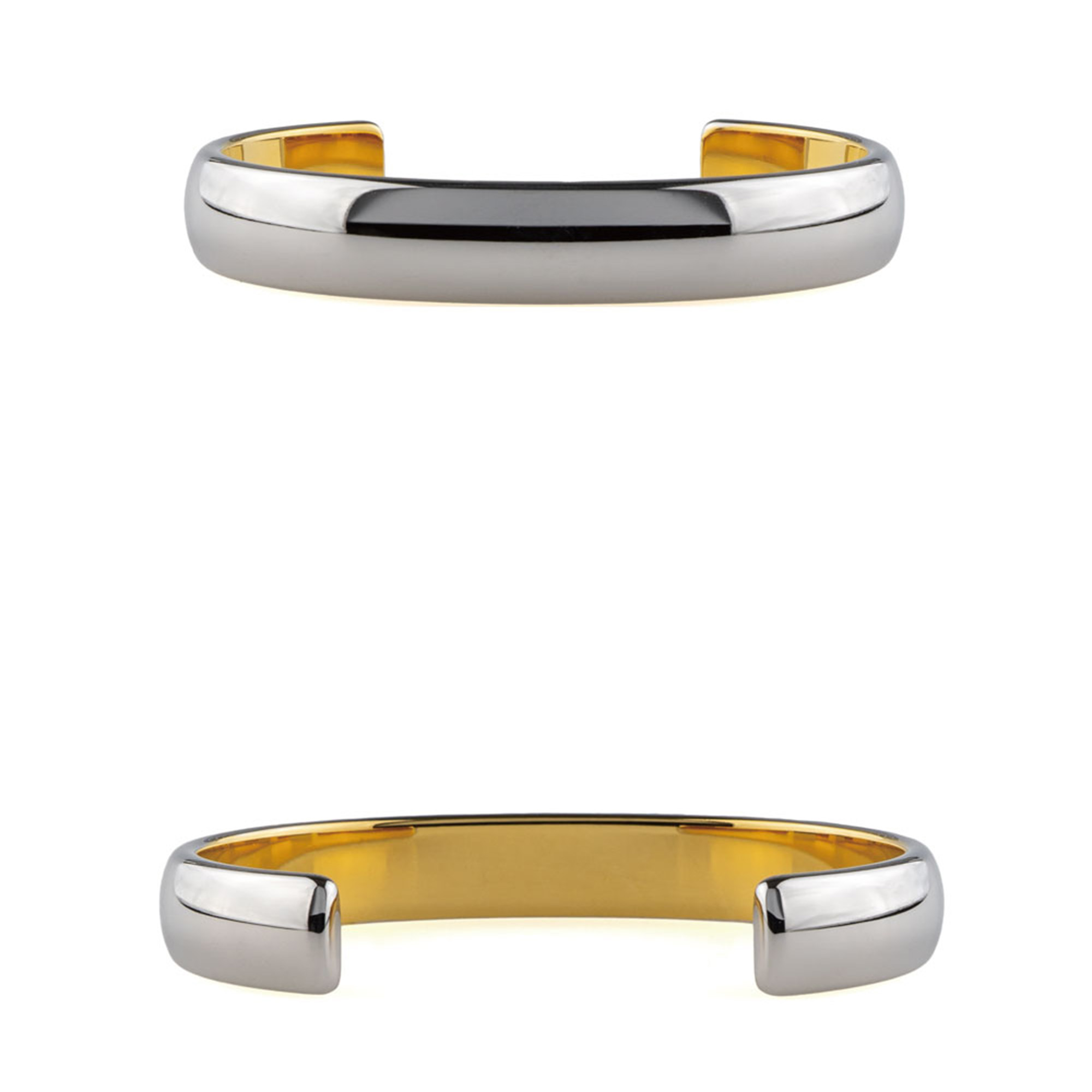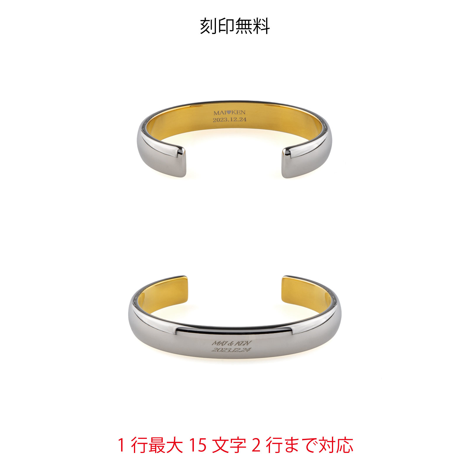 表面が銀色、内側面が金色の2トーンカラーのシンプルバングル。表面、内側面ともに弧をうっており、中央部分に向けて山なりのデザインです。光沢仕上げで曲線を描いていることで、より反射しやすく高級感のある仕上がりとなっております。お好きな言葉を、無料で刻印いたします。