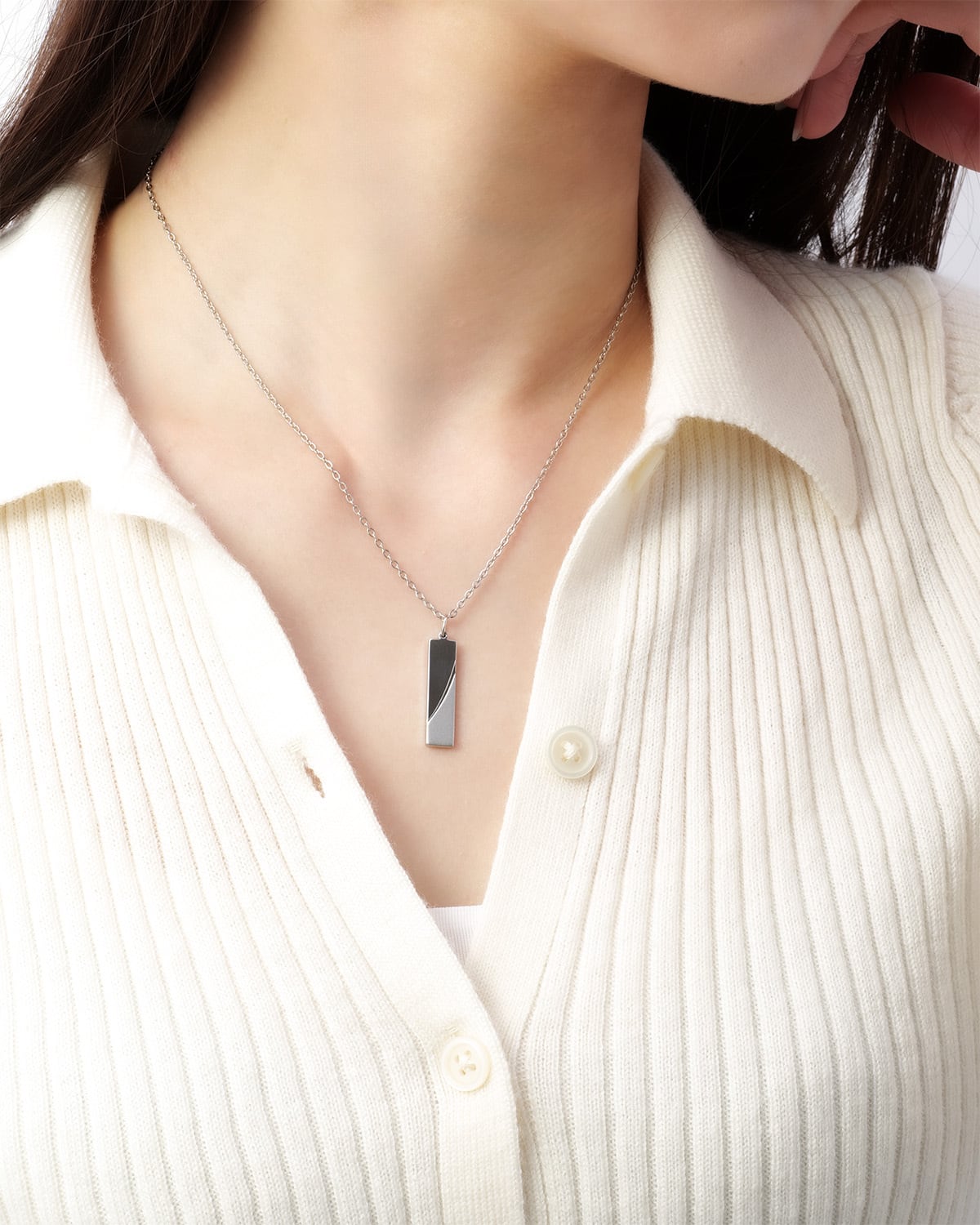 洗練された小ぶりのプレートデザインの「Plate Necklace SND」。サージカルステンレス製で変色しにくいため、日常生活で安心してお使いいただけます。ユニセックスデザインのため、メンズアクセサリー、ペアネックレスとしても使用できます。