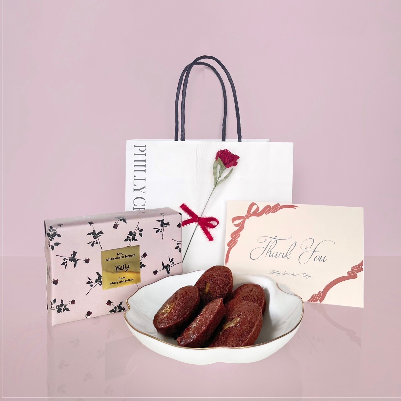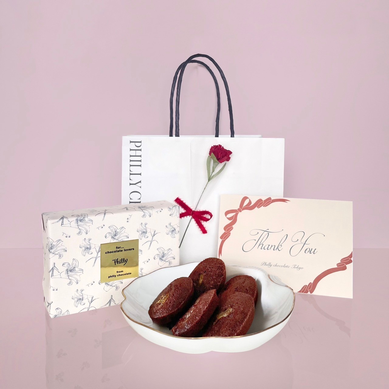 チョコレート生地にレモンピールをのせたフィナンシェです。可愛い包装紙は、4種類の柄からお選びいただけます。ちょっとした手土産にお持ちいただきやすいようブランドショッパー、メッセージカード、造花をセットにいたしました。
