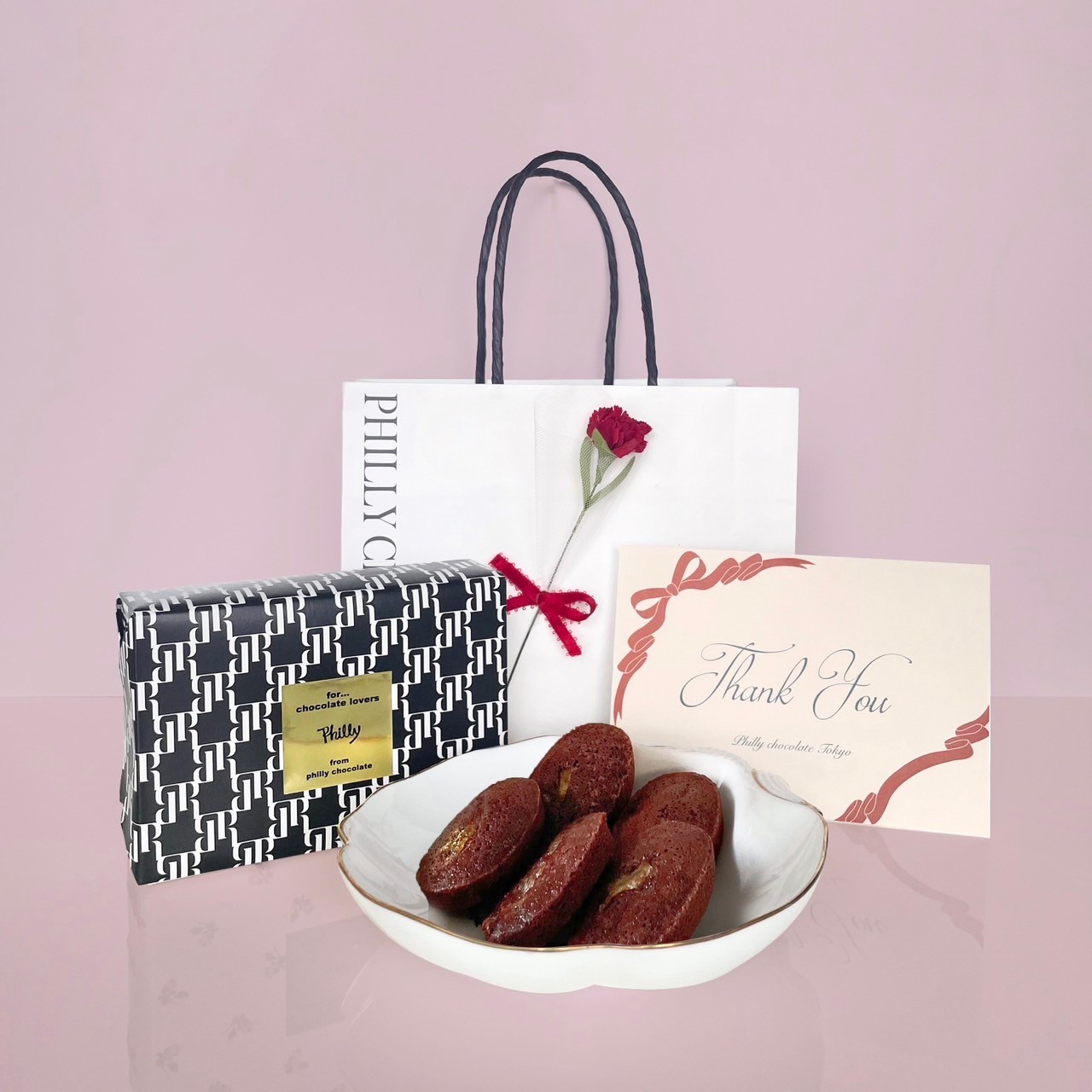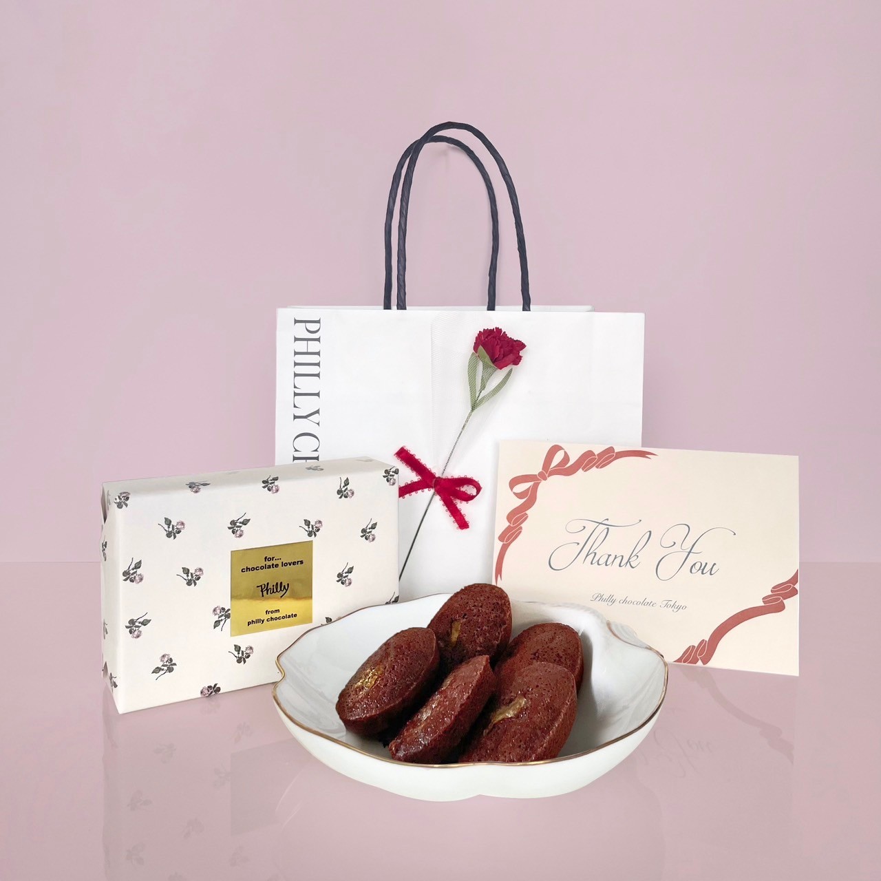 <セット内容> ・フィナンシェ5個入りBOX(チョコレートレモン) ・メッセージカード ・お花(造花) ・ブランドショッパー(紙袋)